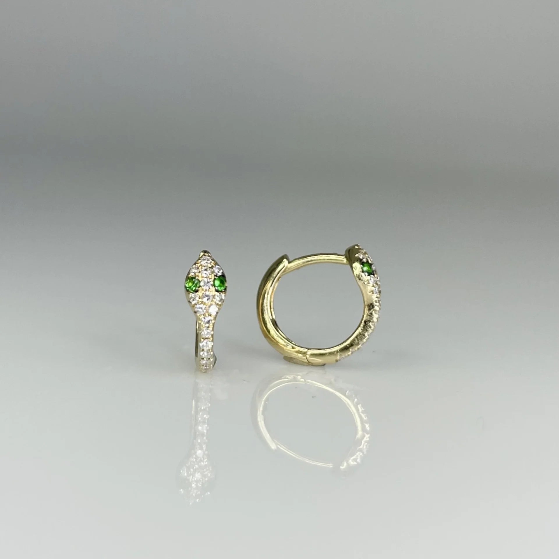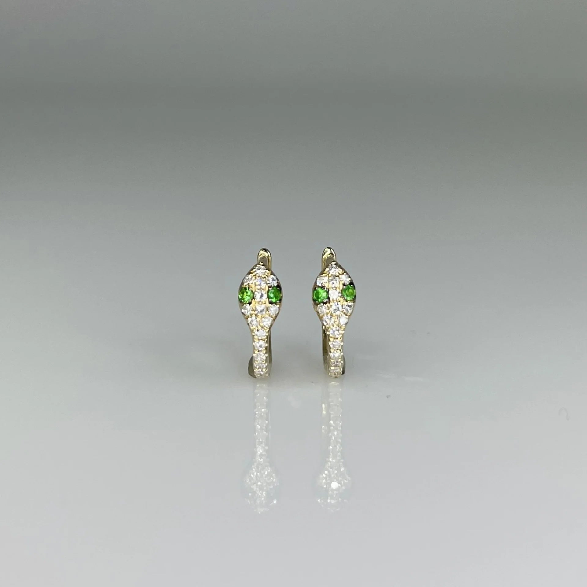 These 14 karat yellow gold snake earrings have micro pave white diamonds set throughout. They also feature small emerald eyes, for a touch of color. Each earring is 10x12mm in size, great for a standalone look, or a simple stack. Total diamond weight is 0.11ct Total emerald weight is 0.04ct. Emerald is the birthstone for May.