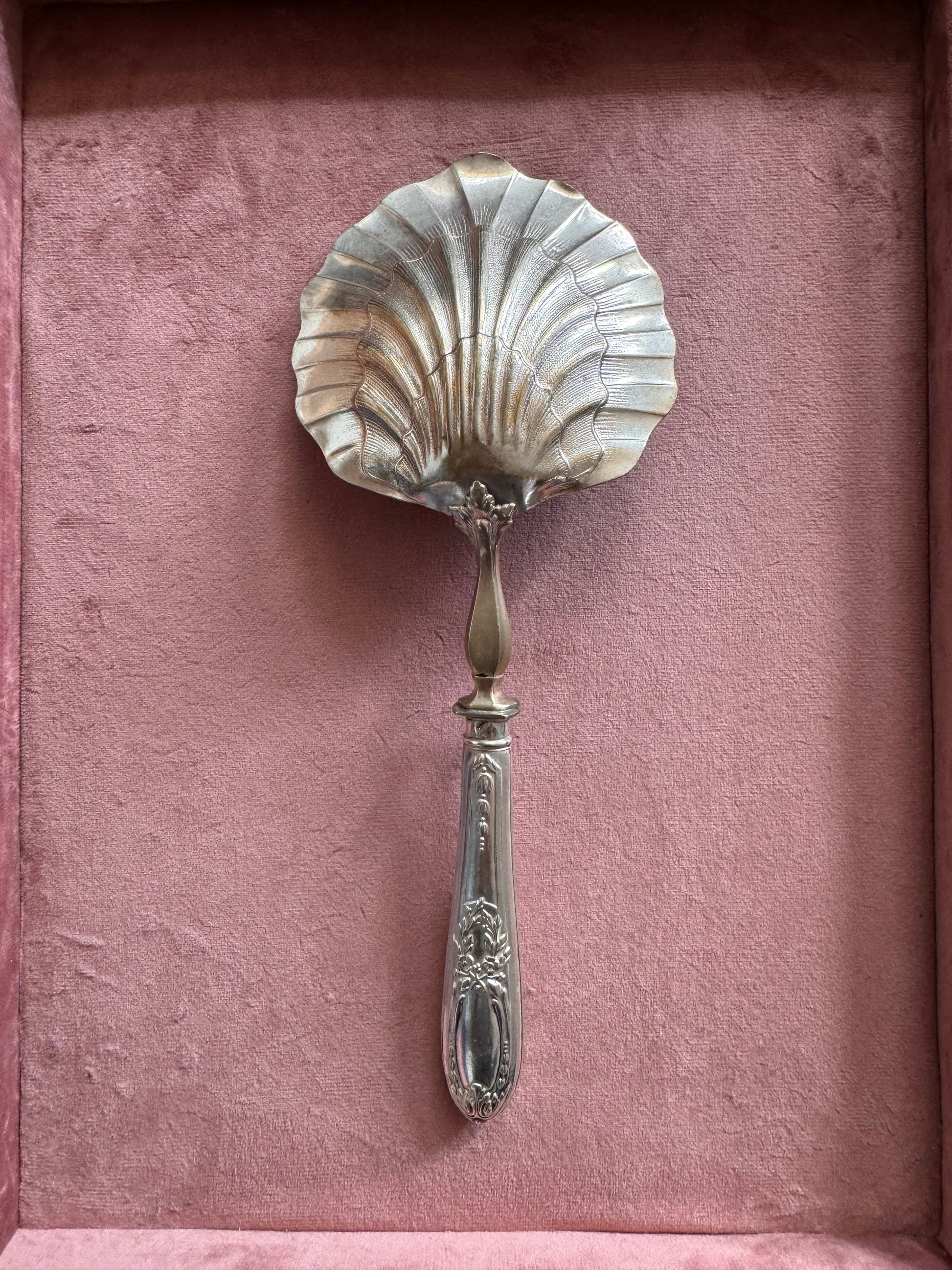 Silver plated serving spoon with vine and scallop shell motif