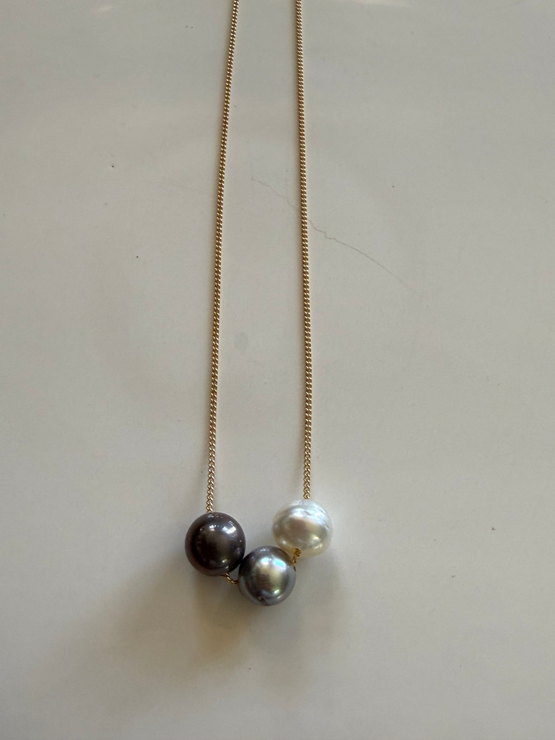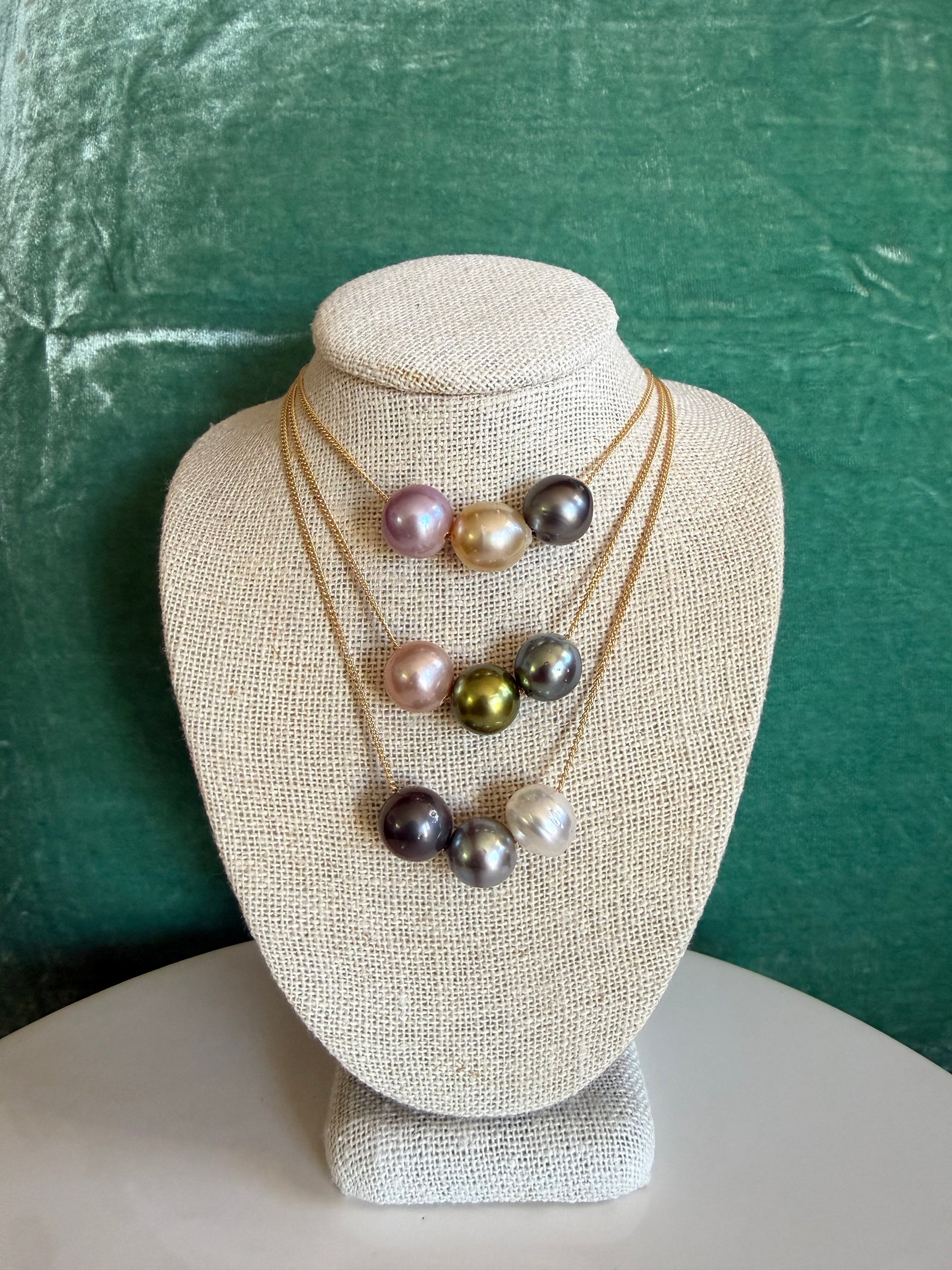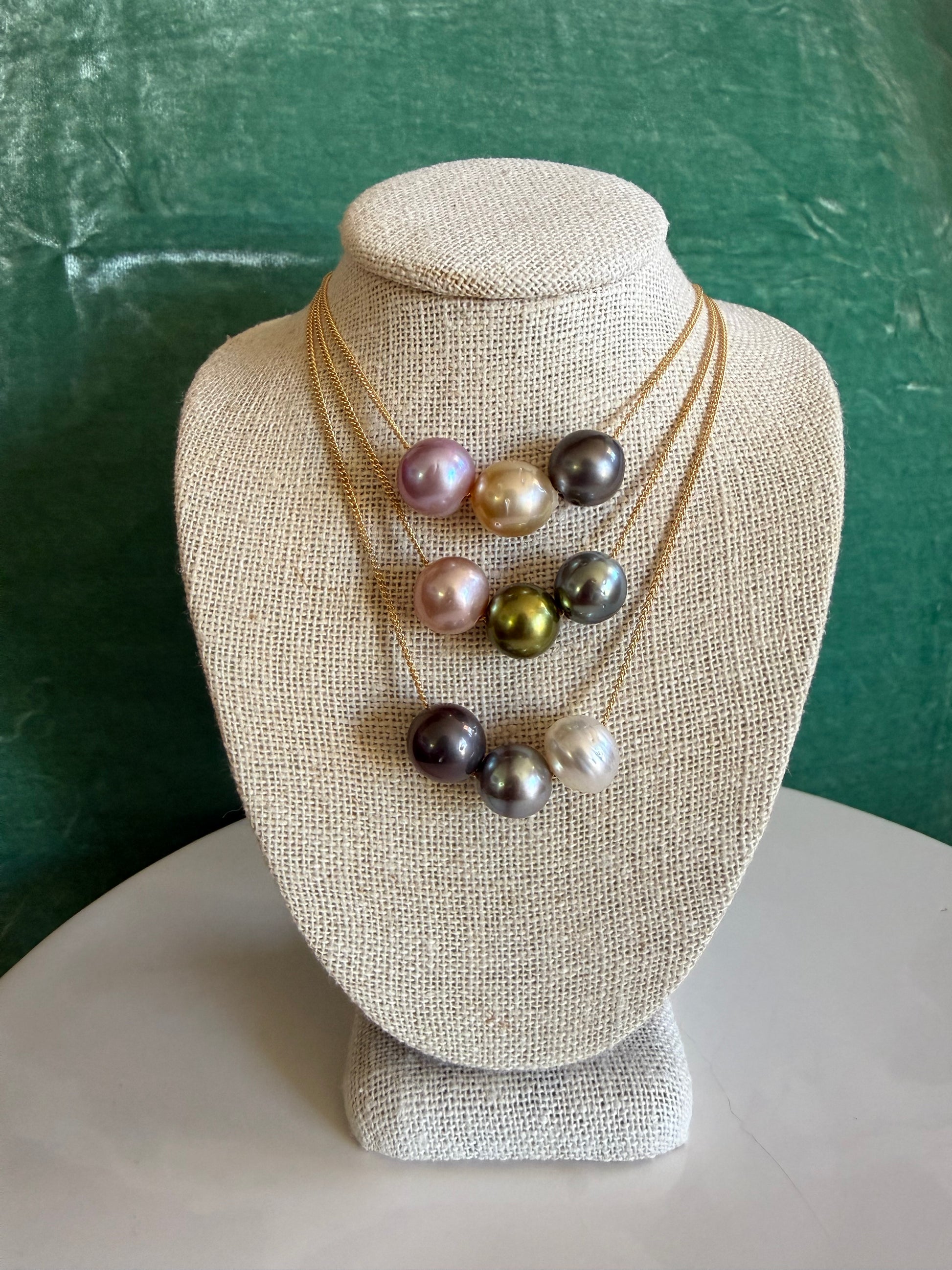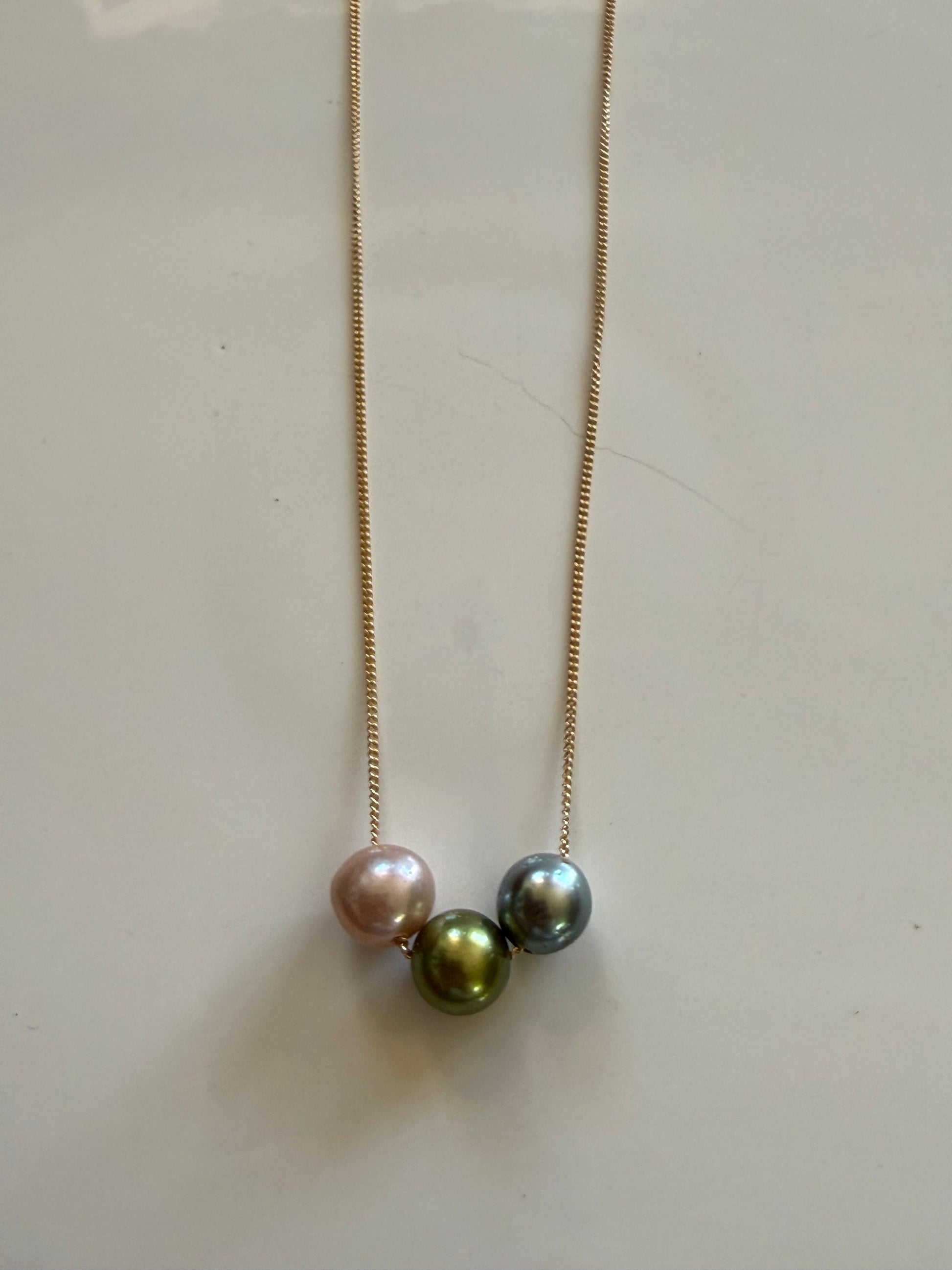 Pink Edison, Golden Edison, Pistachio, Tahitian on a 14k gold filled chain, approximately 17" length