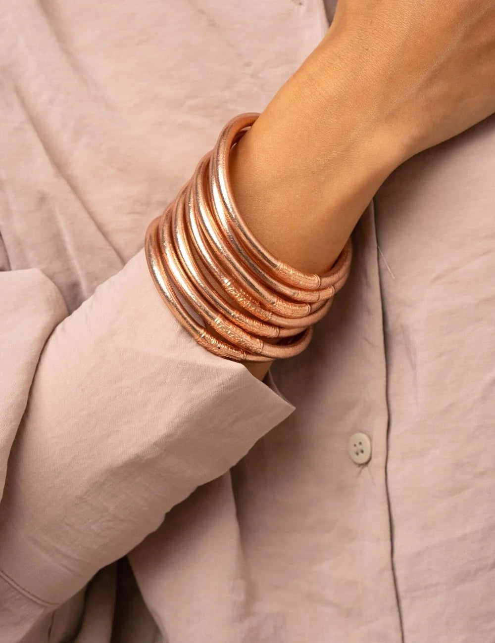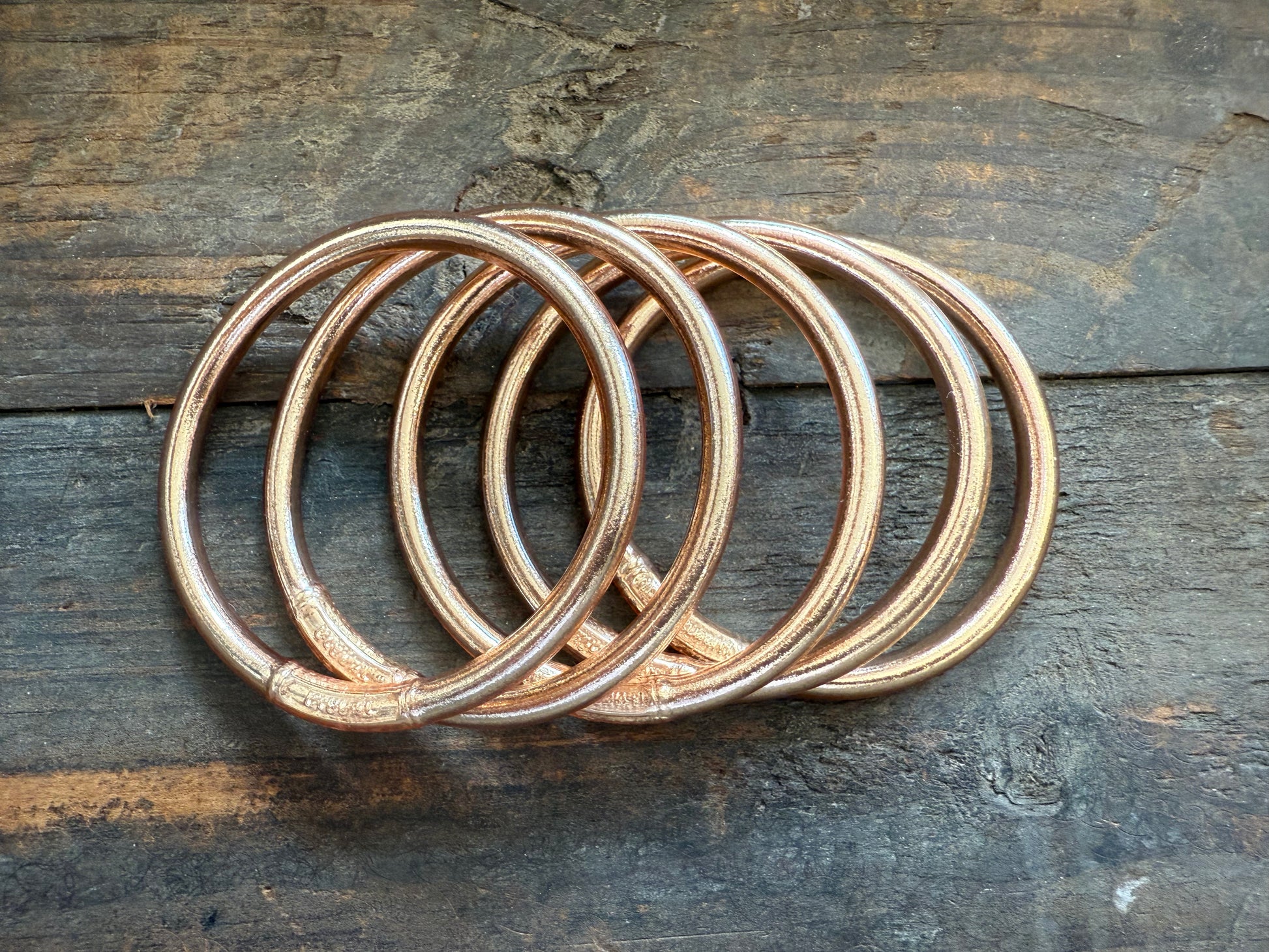 Prayer Bangles are rubber filled with vibrant gold leaf. The gold leaf blown through them is said to be reminders of our prayers and intentions.They have an authentically antiqued look and they're durable, flexible, soundless and won't weigh you down. Great for traveling since you do not have to remove them to pass through the pesky metal detectors. They're bright gold color looks like a solid gold bangle and feels even better.