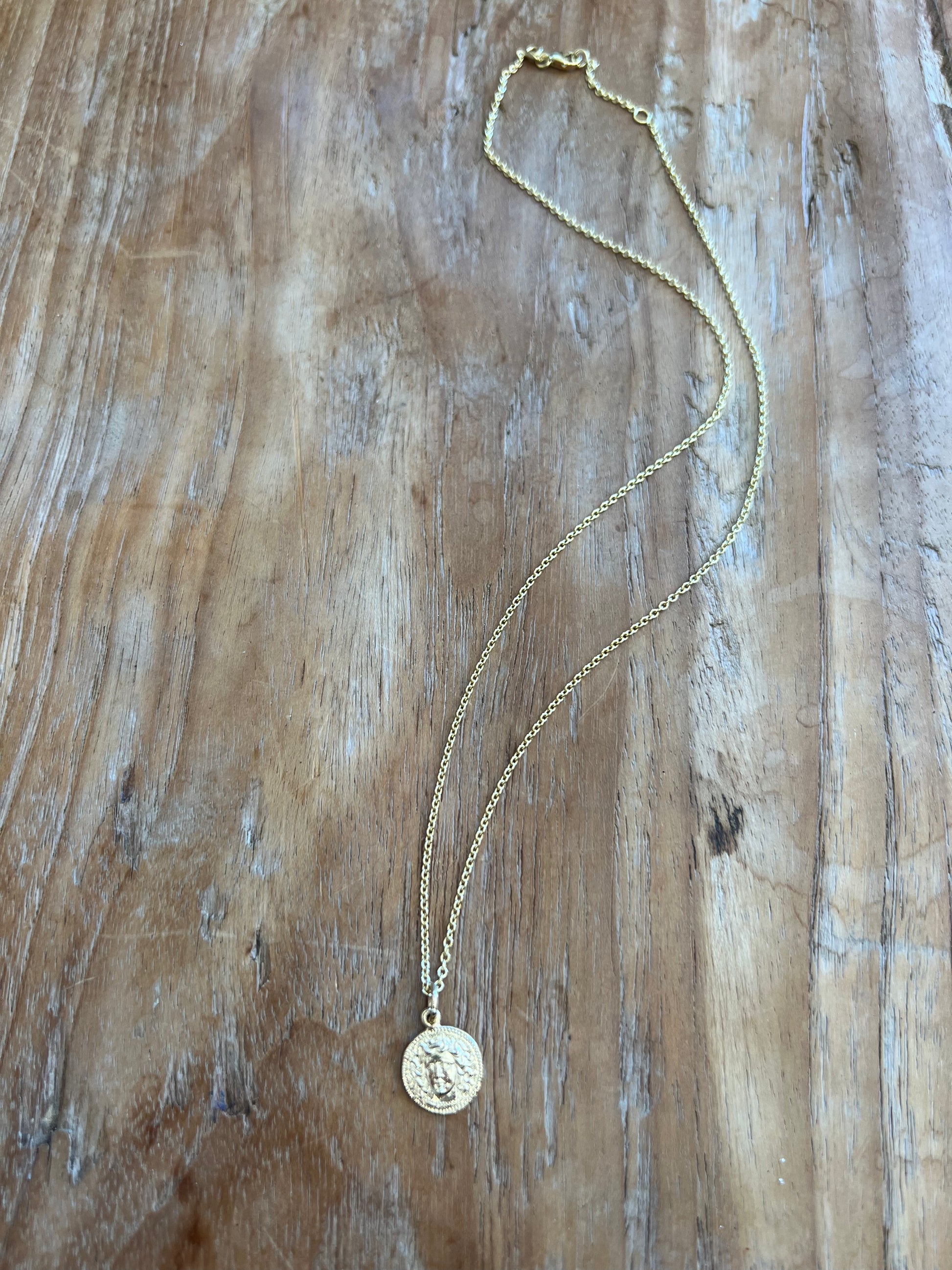 14k yellow gold adjustable 17"-18" round link chain with solid gold Medusa pendant