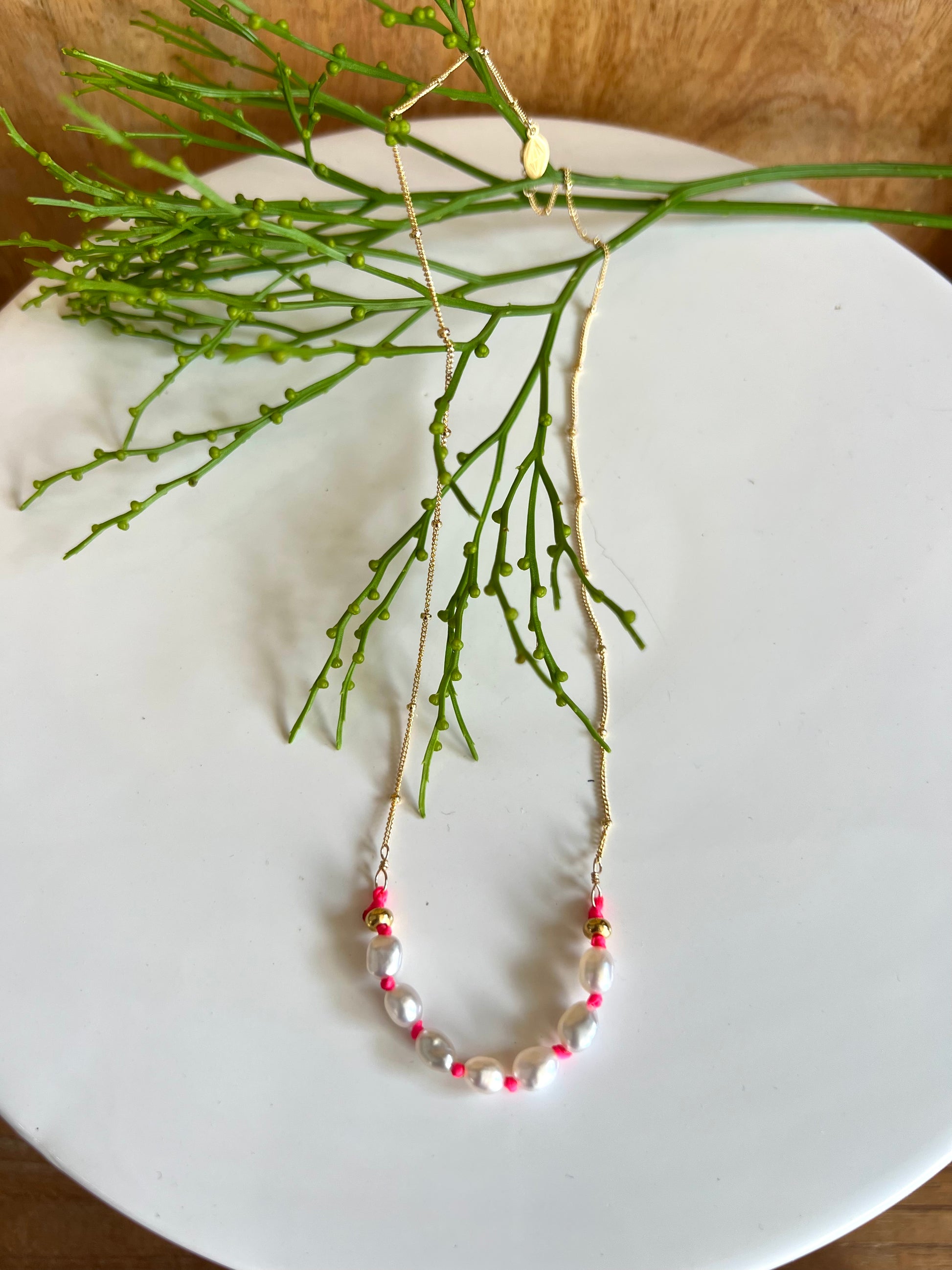 Mini white Tahitian keshi pearls hand tied on pink neon cord, finished with 14k gold filled chain.