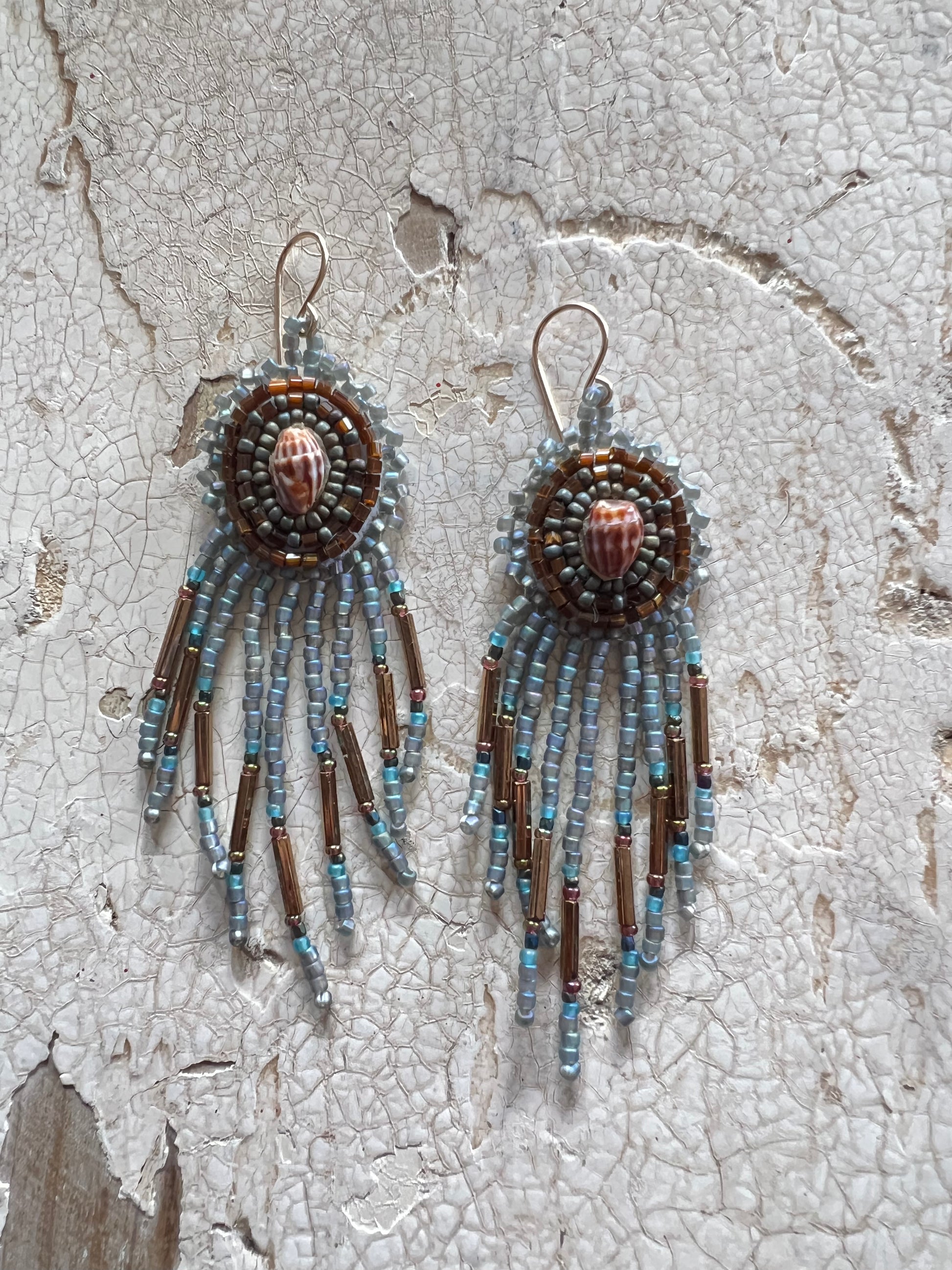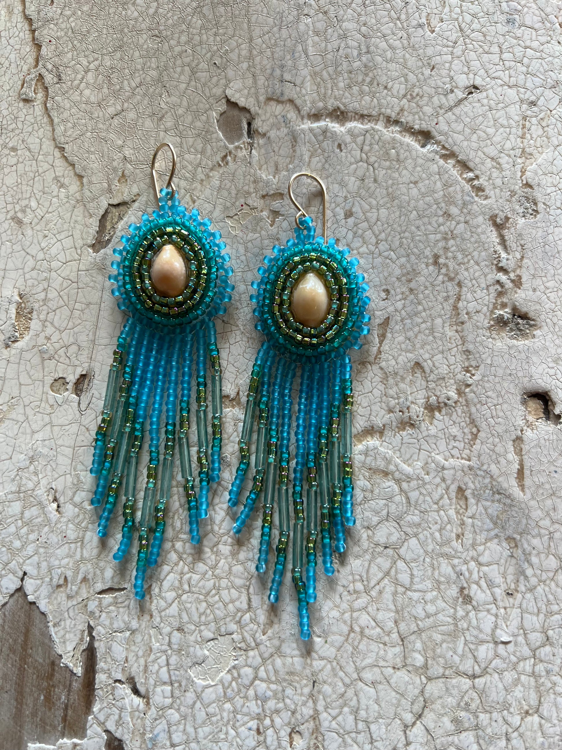 Handcrafted one of a kind beaded fringe earrings made on Maui by artist/designer Marlene Tam