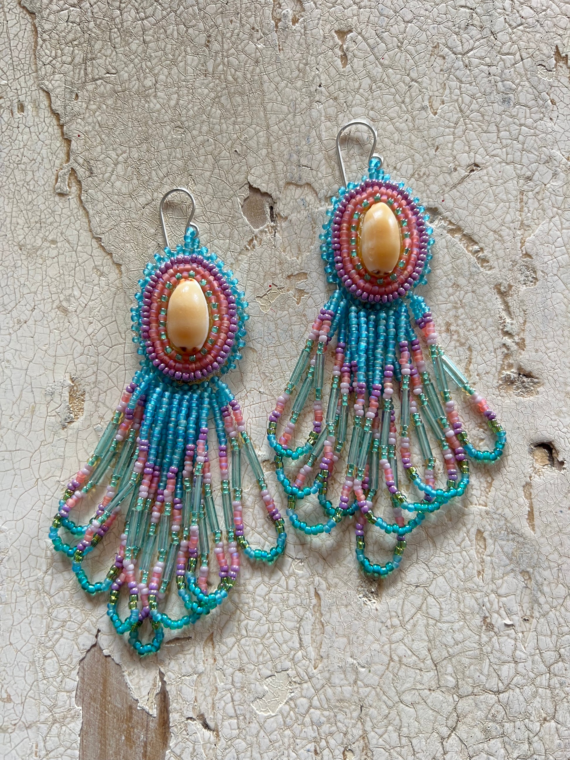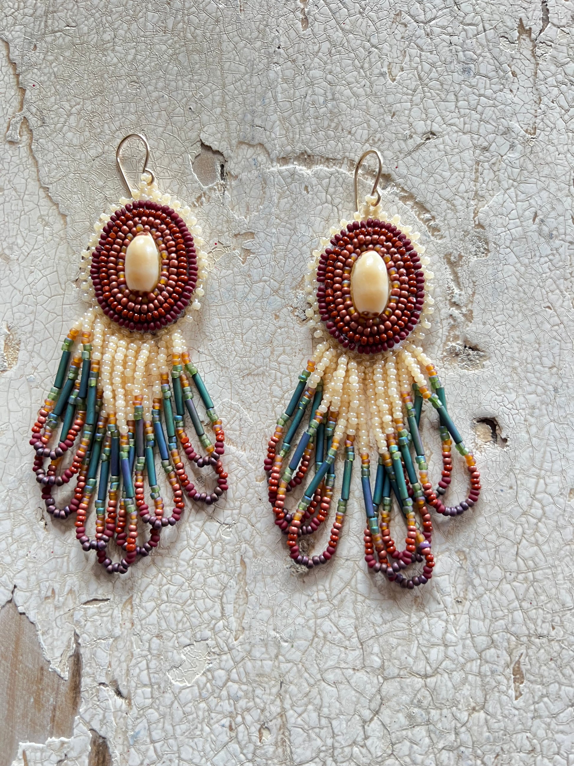 Beaded Cowry Top Loop Fringe Bottom Earrings