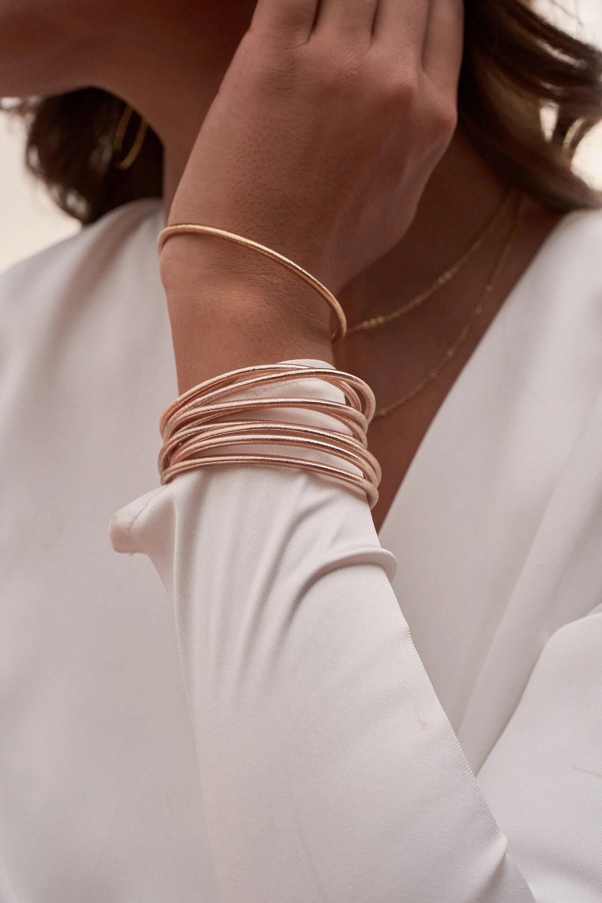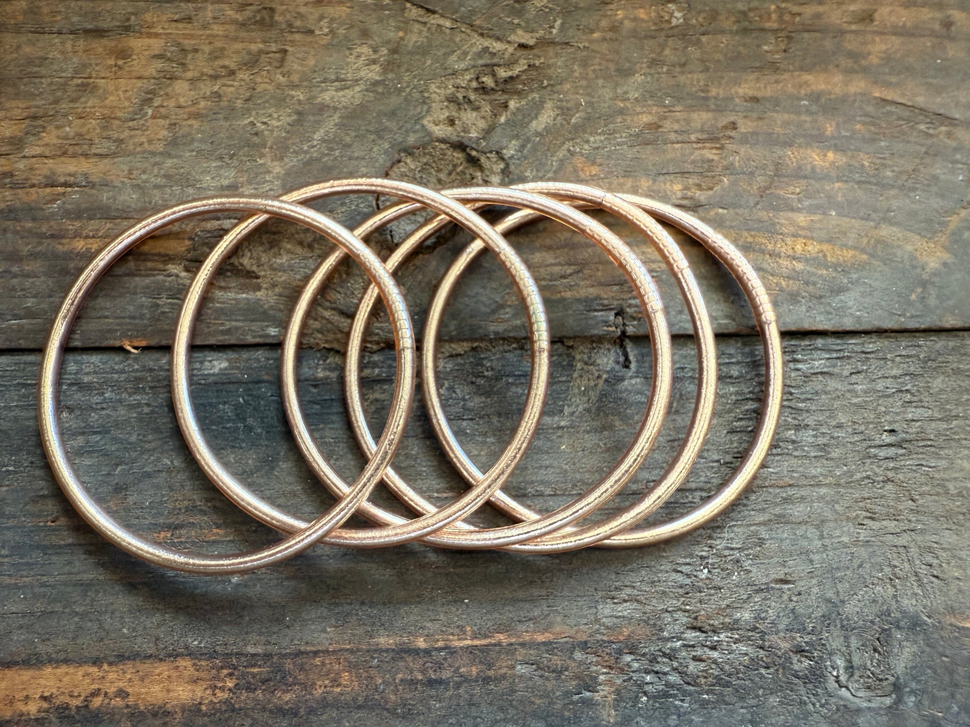 Prayer Bangles are rubber filled with vibrant gold leaf. The gold leaf blown through them is said to be reminders of our prayers and intentions.They have an authentically antiqued look and they're durable, flexible, soundless and won't weigh you down. Great for traveling since you do not have to remove them to pass through the pesky metal detectors. They're bright gold color looks like a solid gold bangle and feels even better.