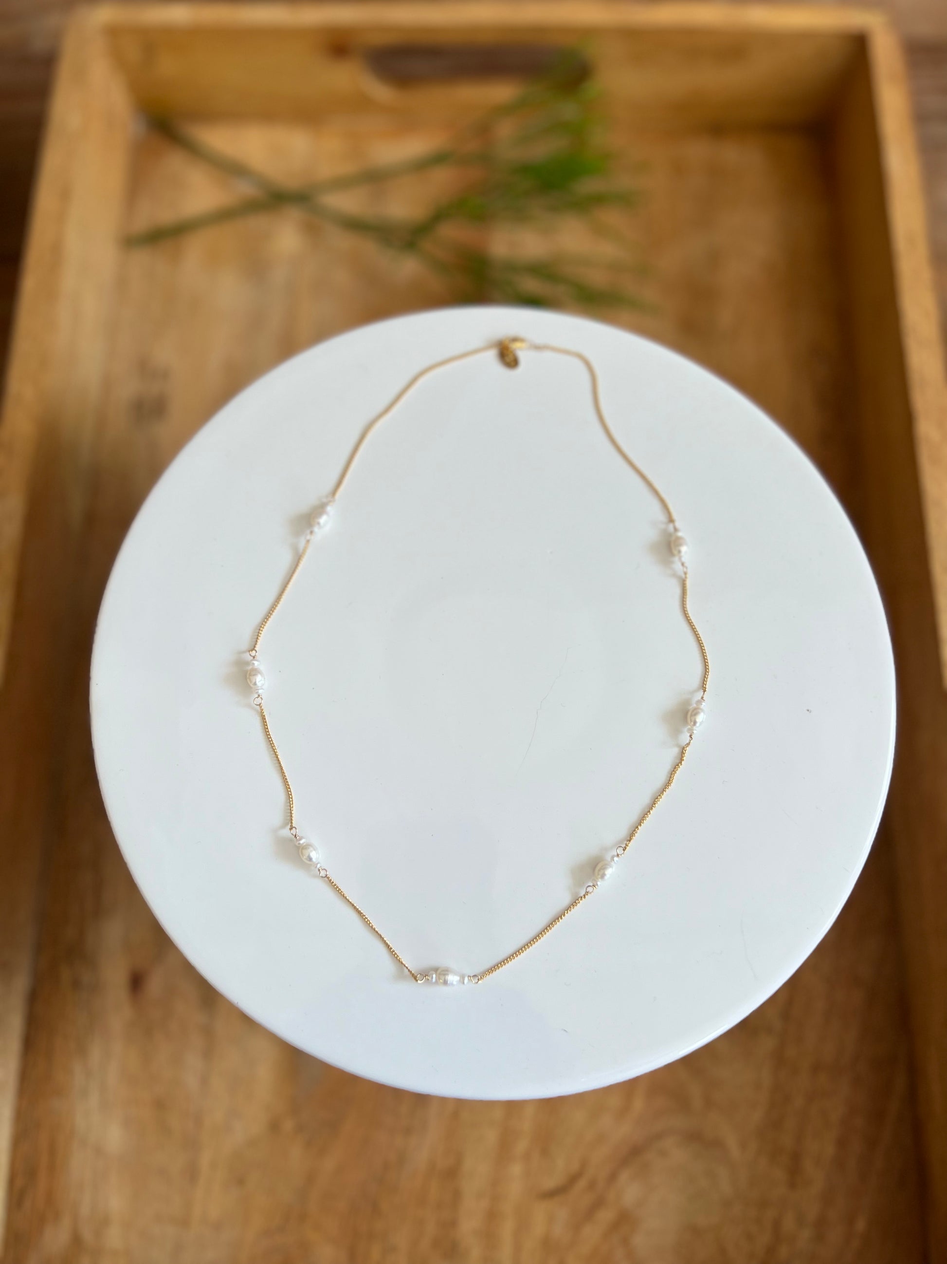 Itty bitty white fresh water pearls with white Tahitian pearls in the center on 14k gold filled chain. This piece is a little longer than our standard chains to give you a nice layering option