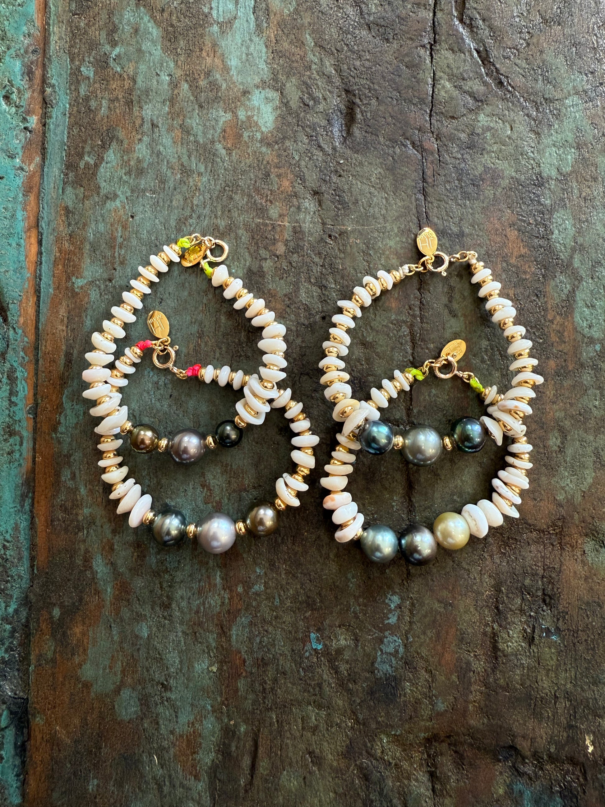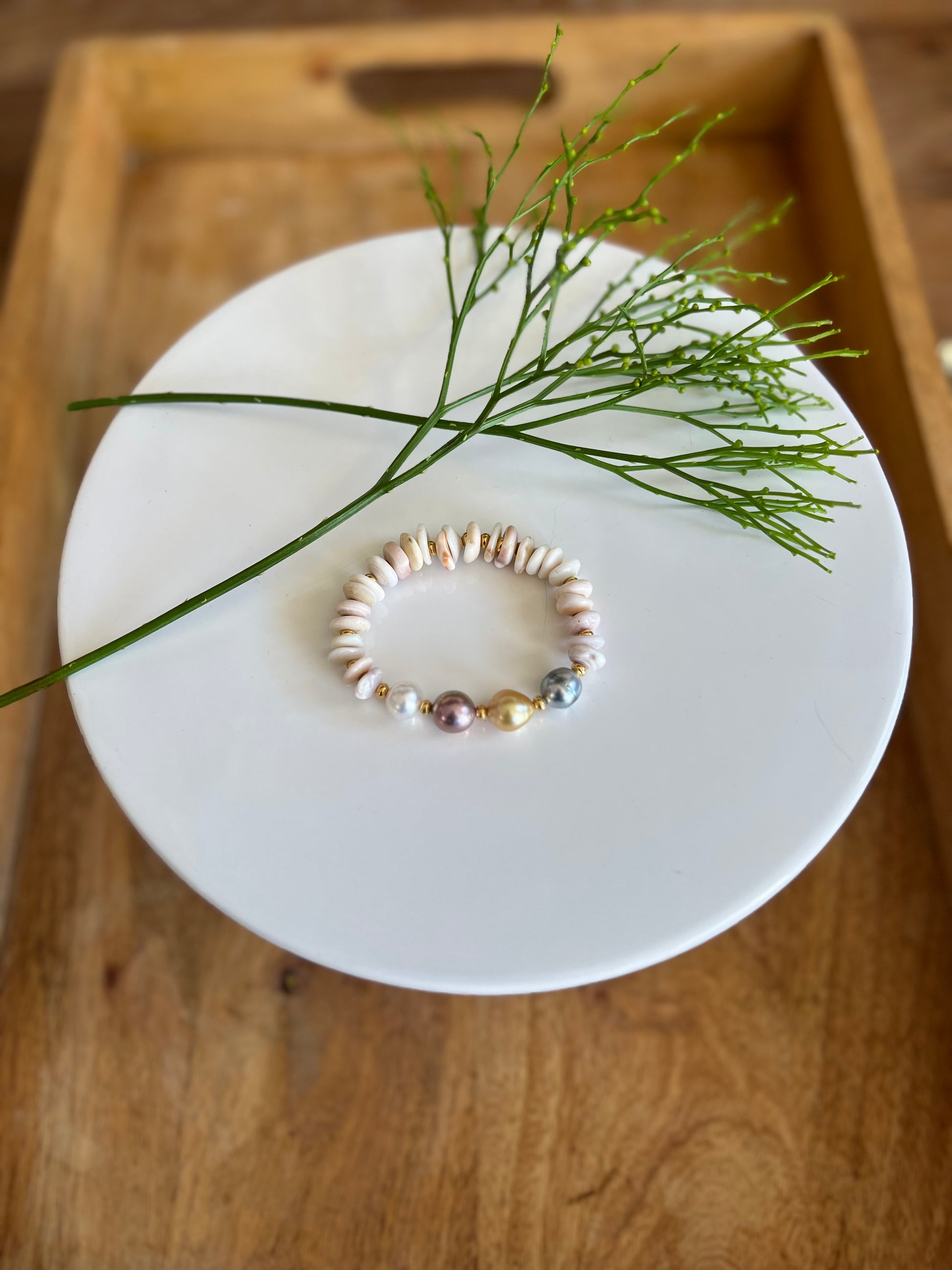West side Oahu puka shells mixed with precious pearls and gold filled beads, strung on an assortment of colored cord that is built to last with a clasp closure.