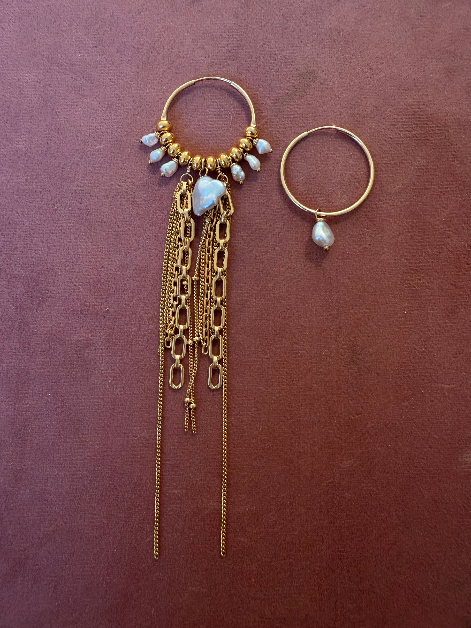 One of a kind 14k gold filled hoop, adorned with a singe Tahitian keshi pearl at the center with Tahitian keshi pearls, 14k gold filled beads + lots of 14k gold filled chain fringe