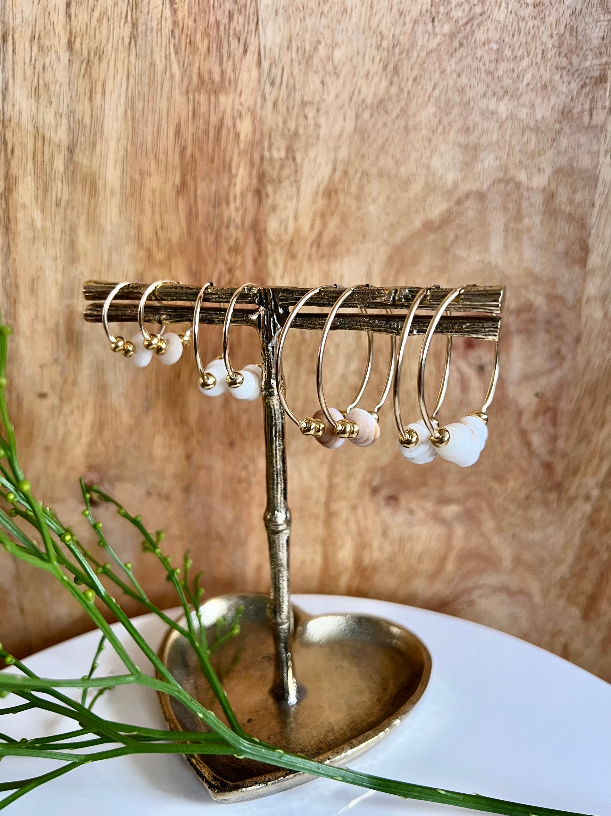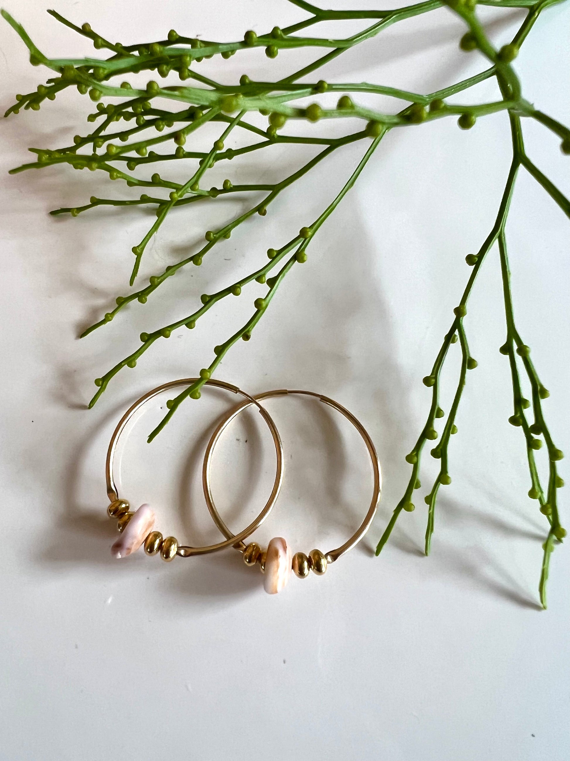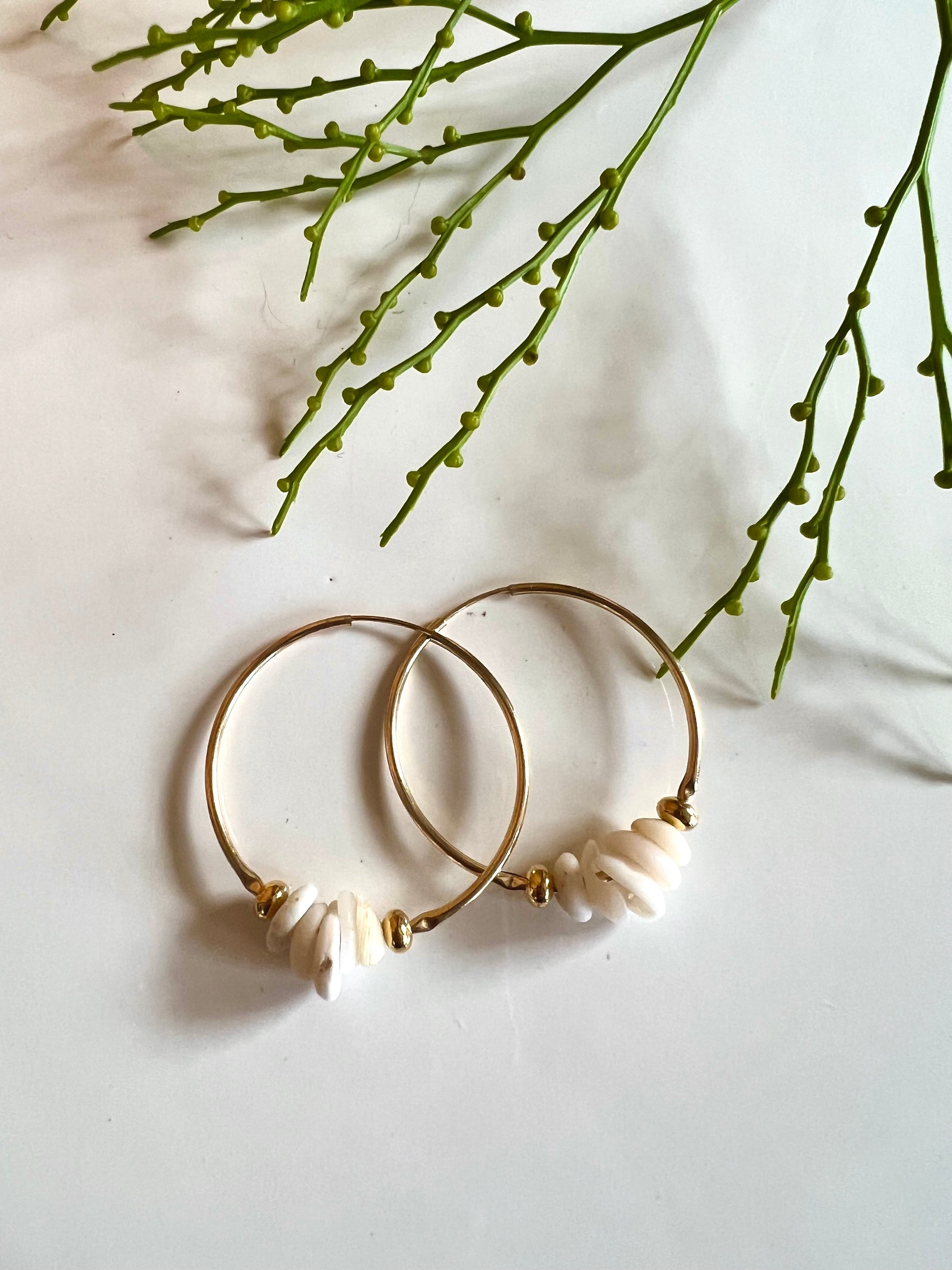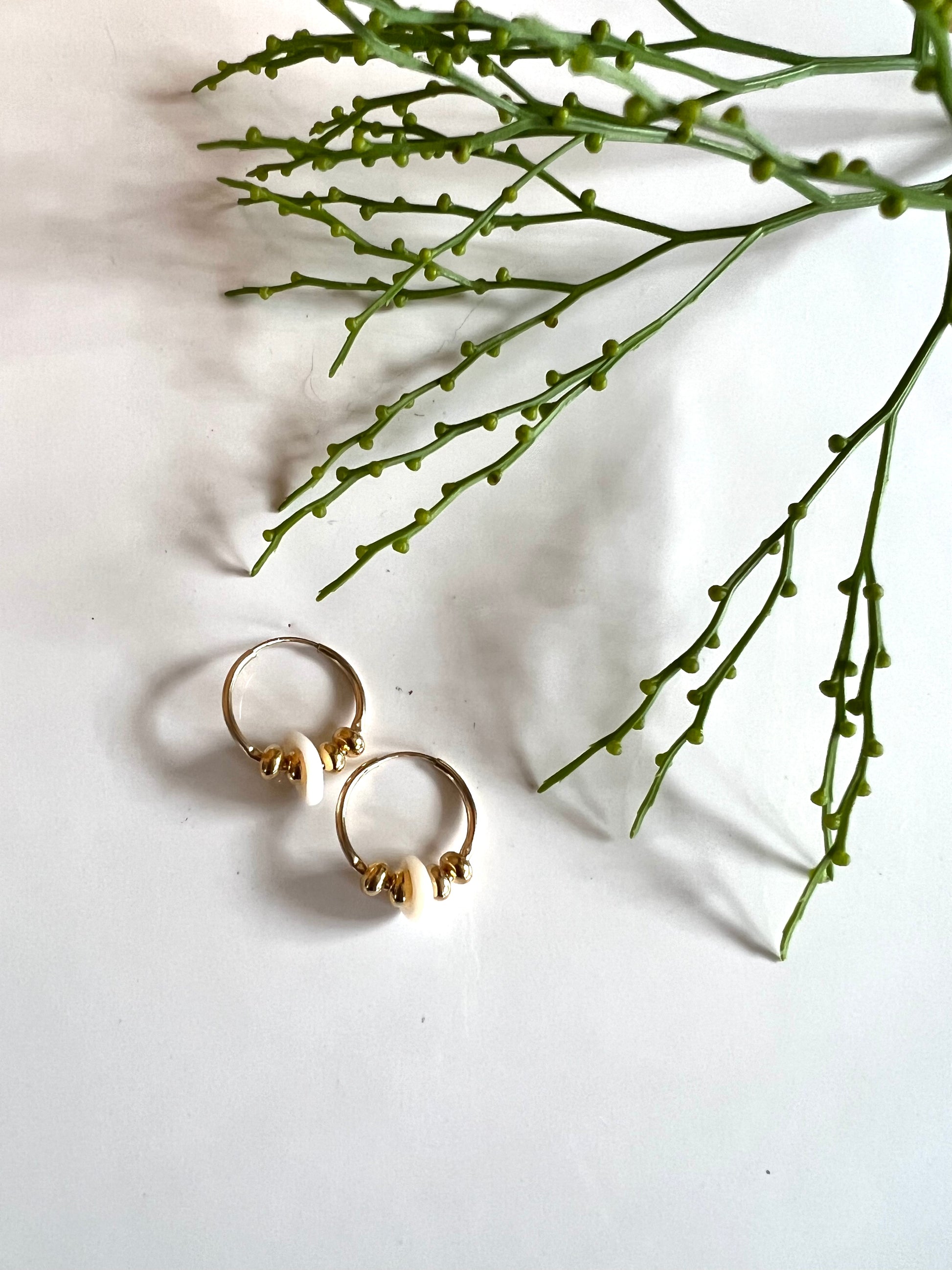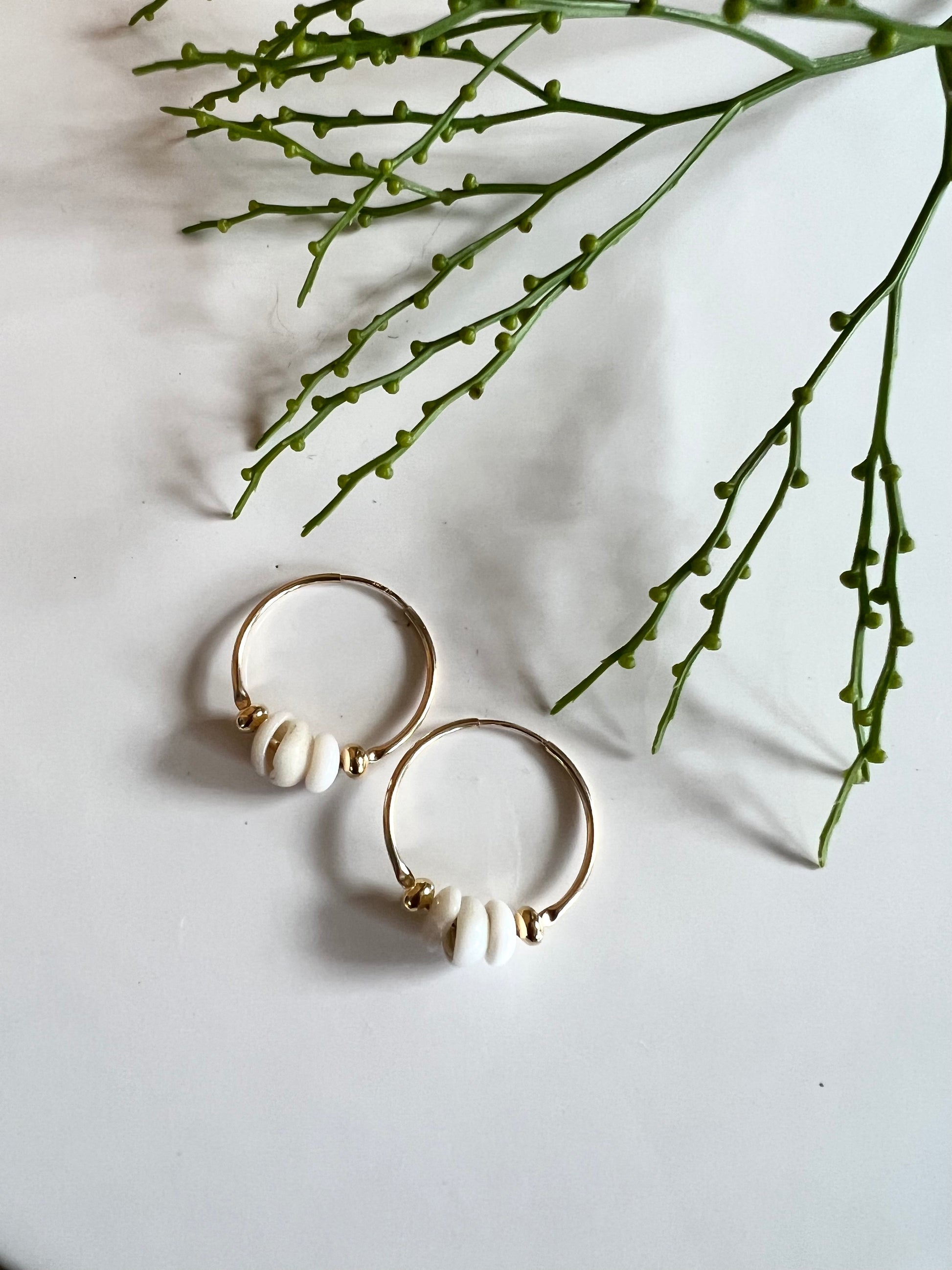 Puka shell hoops with 14k gold filled bead accent on 14k gold hoops.