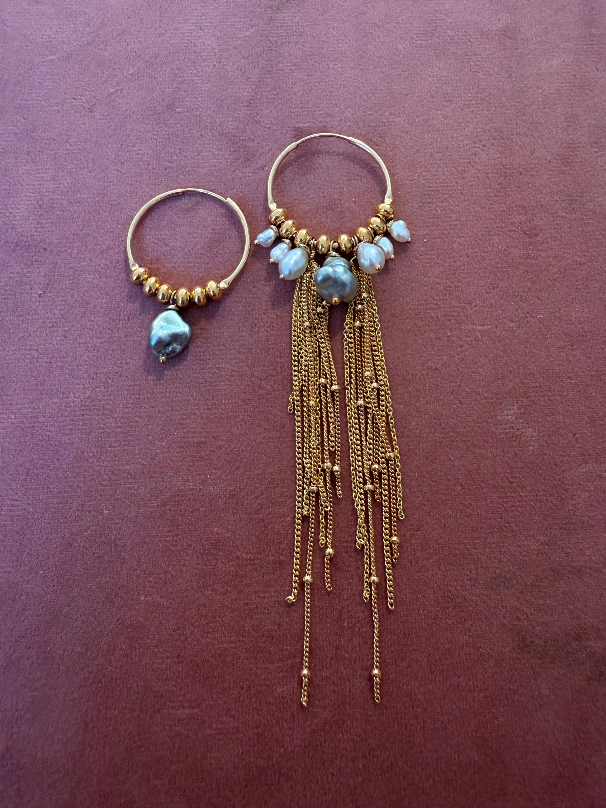 One of a kind 14k gold filled hoop, adorned with a singe blue pistachio keshi pearl at the center with Tahitian keshi pearls, 14k gold filled beads + lots of 14k gold filled chain fringe