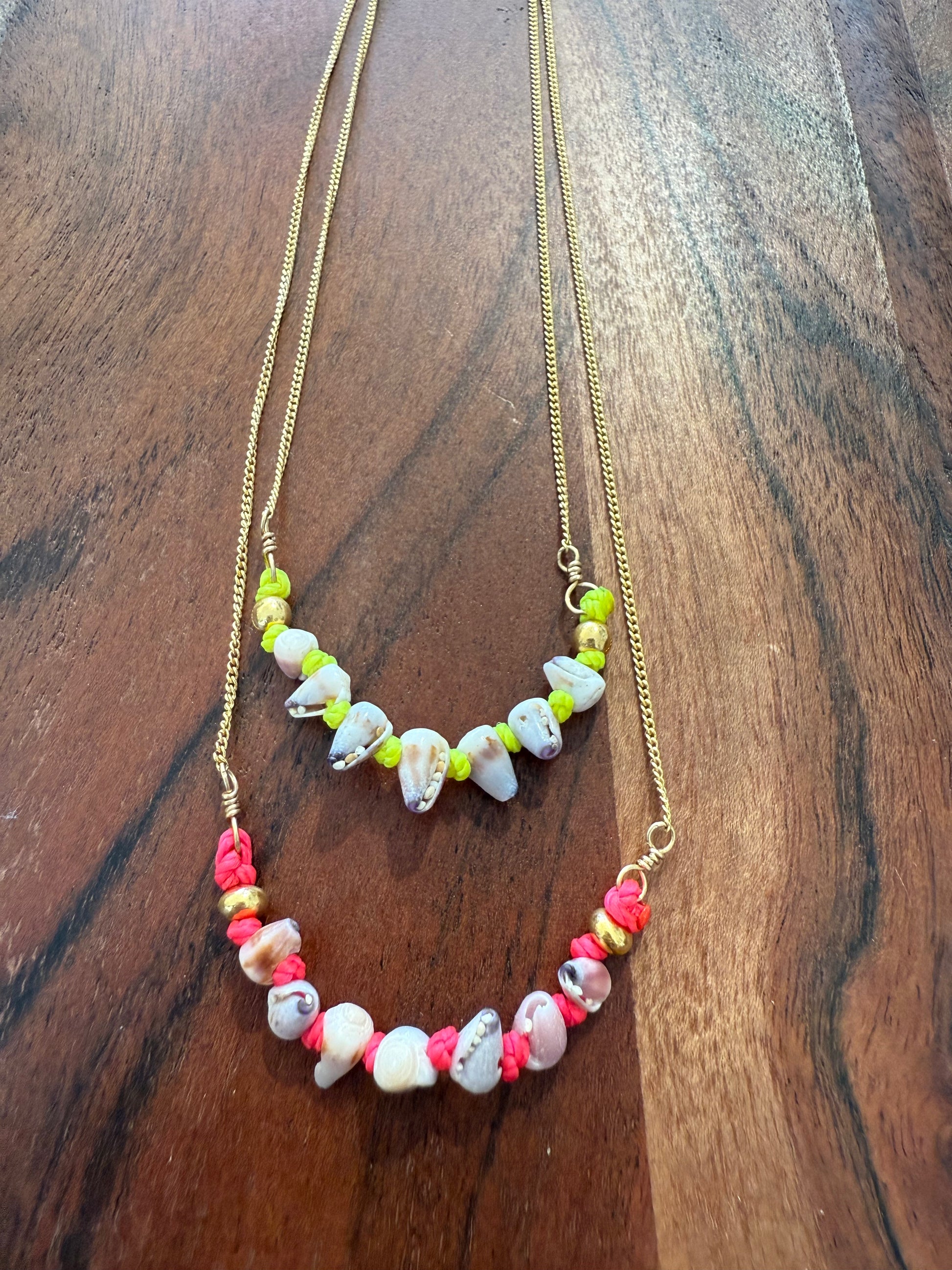 Mini cone shells hand tied on pink neon cord, finished with 14k gold filled chain.