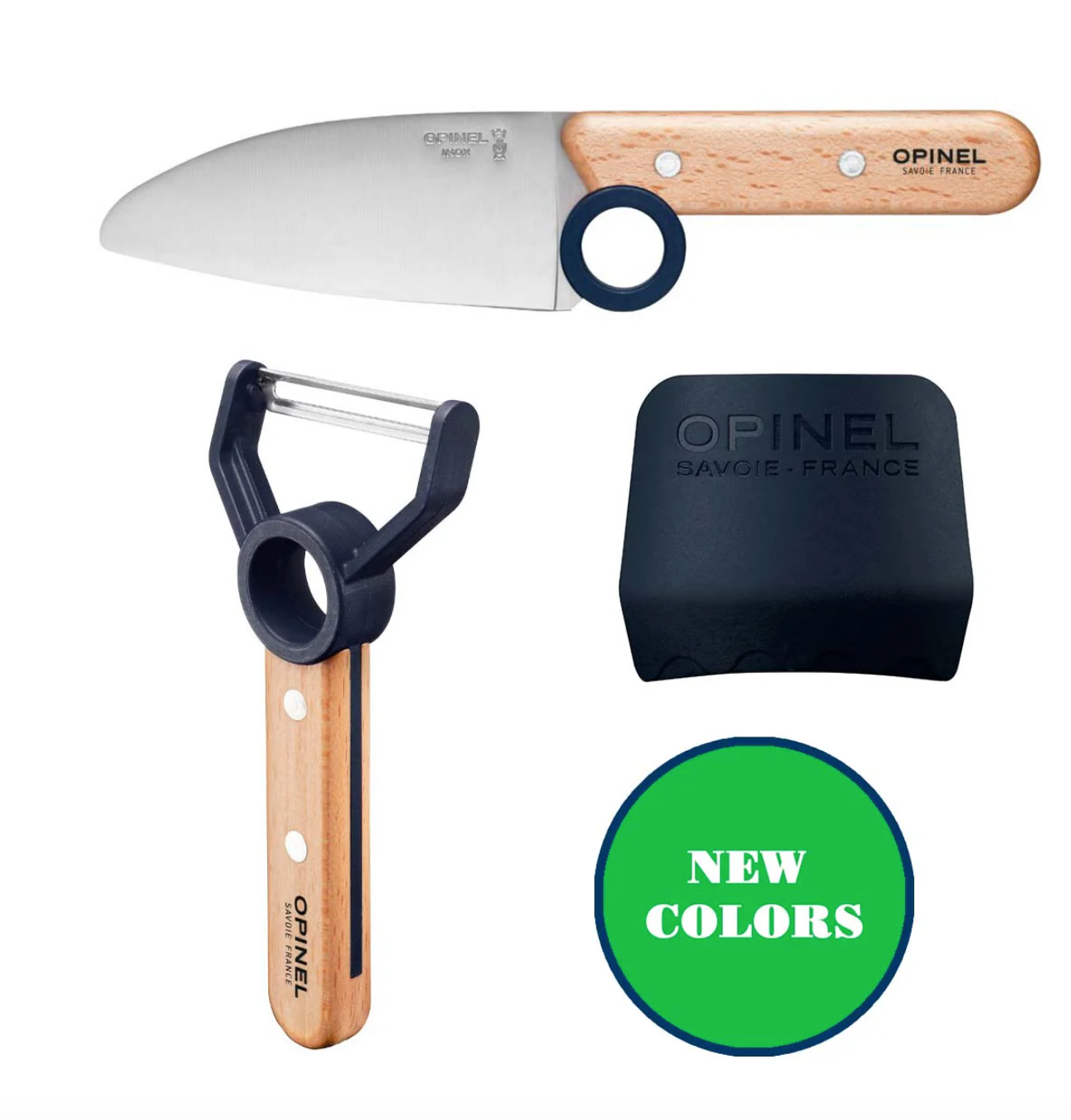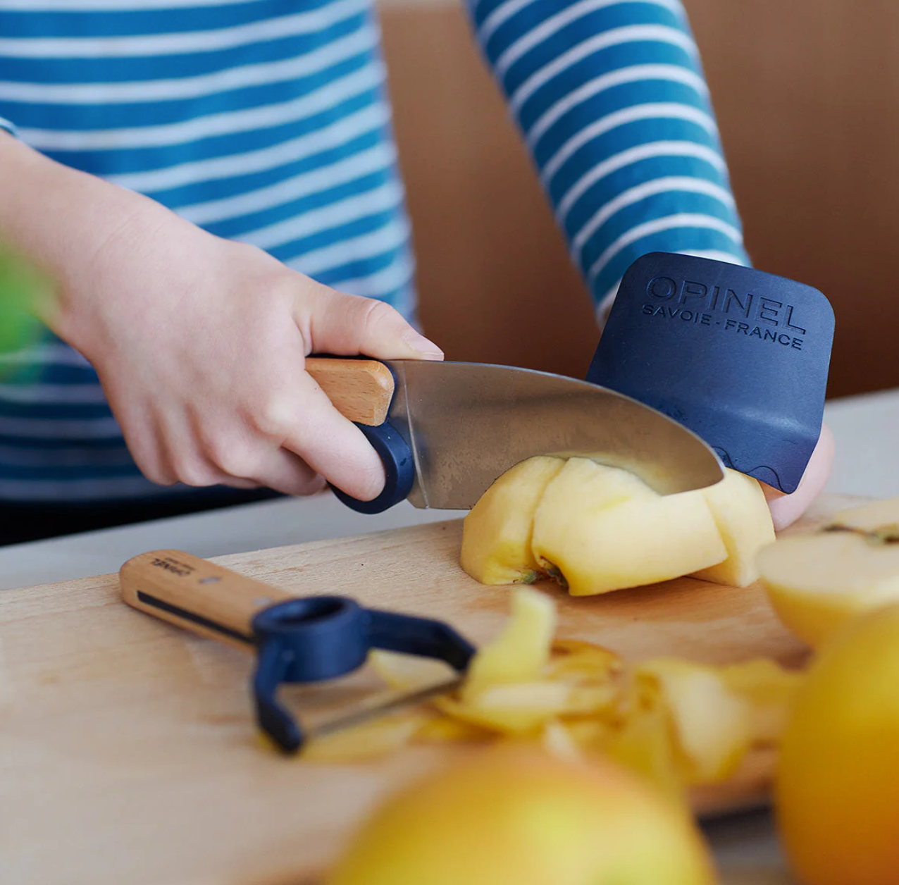 Little chefs deserve tools, not toys. The Le Petit Chef set gets children cooking with an educational, scaled-down chef’s knife, finger guard, and peeler. The knife includes a small ring that children instinctively use to position their index finger and the rest of their hand, encouraging safe knife handling while also teaching proper cutting technique. Outfitted with the right tools, children learn to love good food and cooking alongside adults in the kitchen. Use with adult supervision.