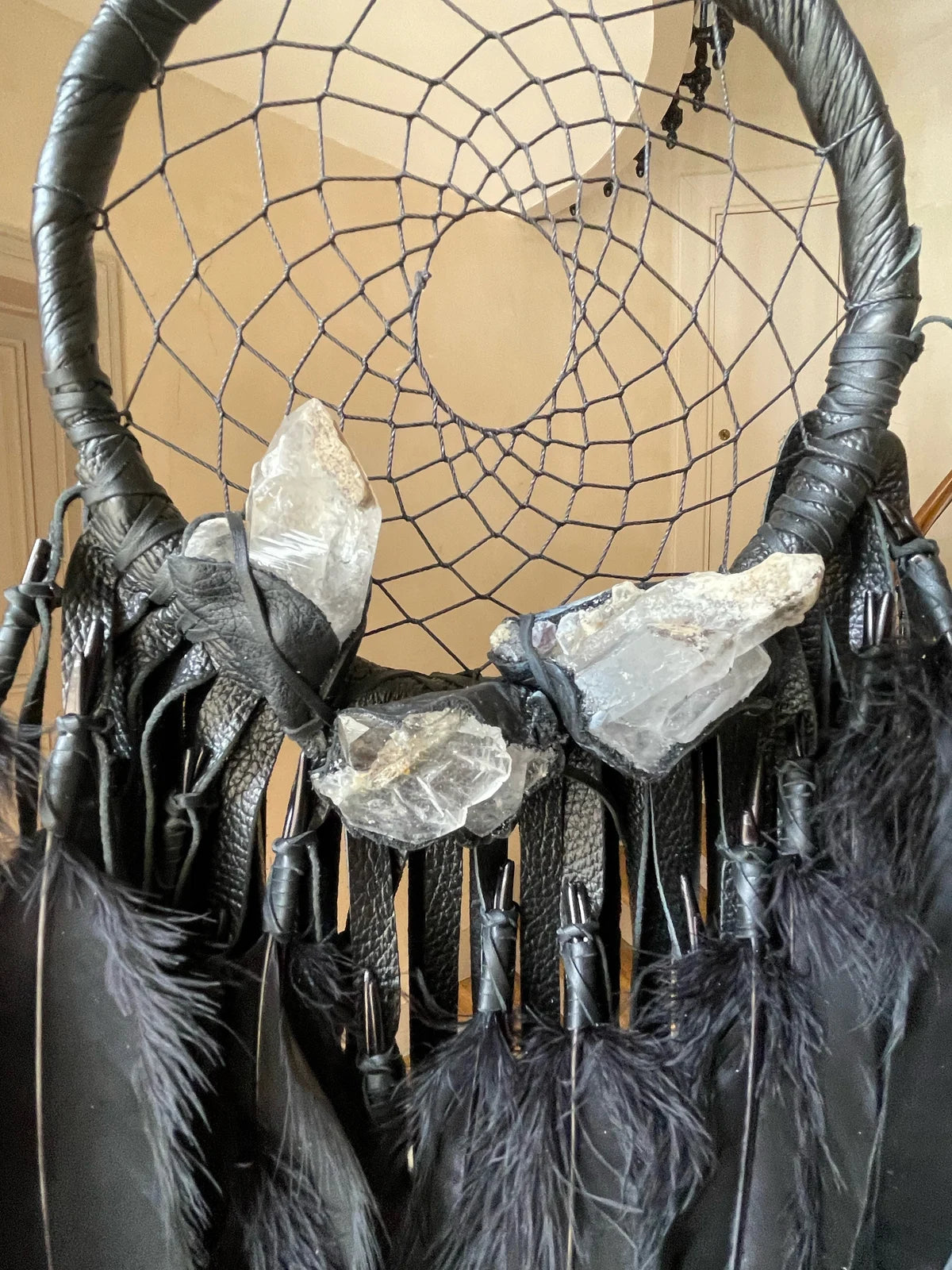 The inner web is woven by hand with the intention of capturing all of the bad dreams while allowing the good ones to pass through the centre. The web is representative of Natures' ultimate connection that links all beings. The frame is adorned with a with a sparkling cut, Clear Quartz crystal. It is believed that they have the ability to receive or transmit energy