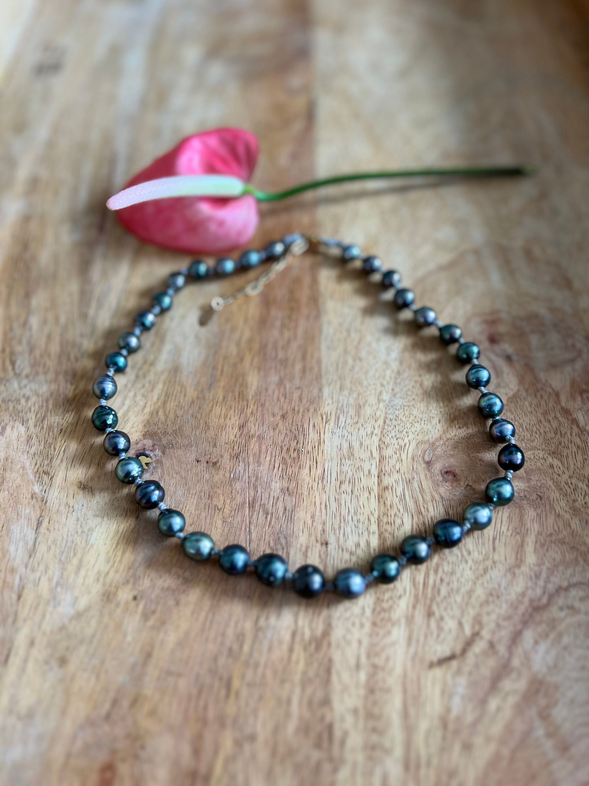 Tahitian pearls strung on neon pink, hand tied with gold filled bead accents and 14k gold filled chain extender and clasp.