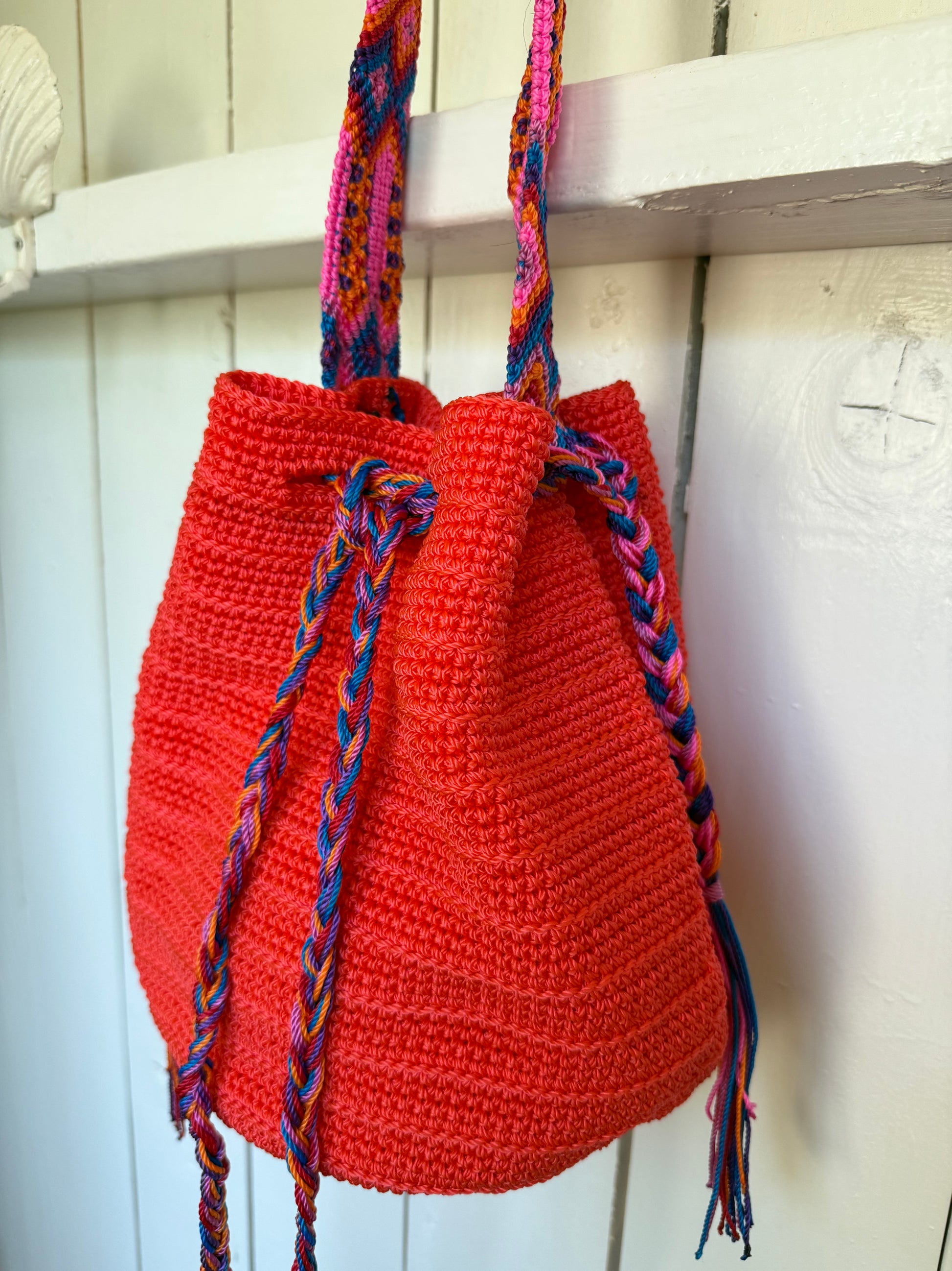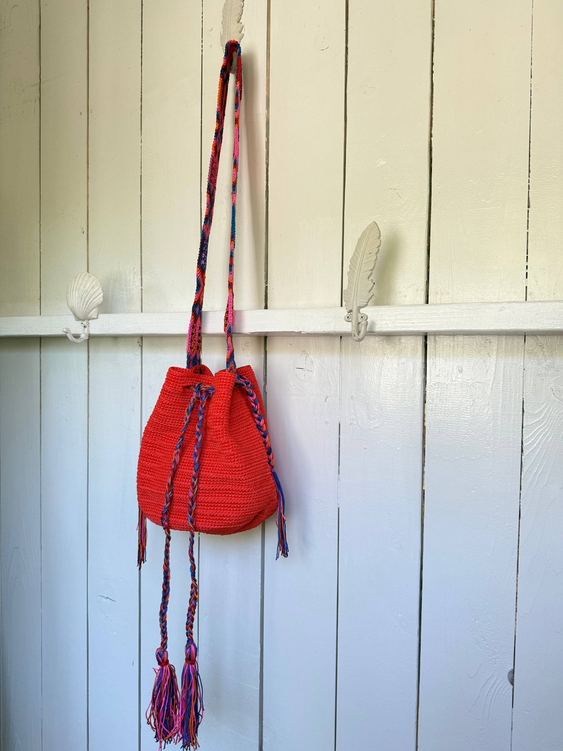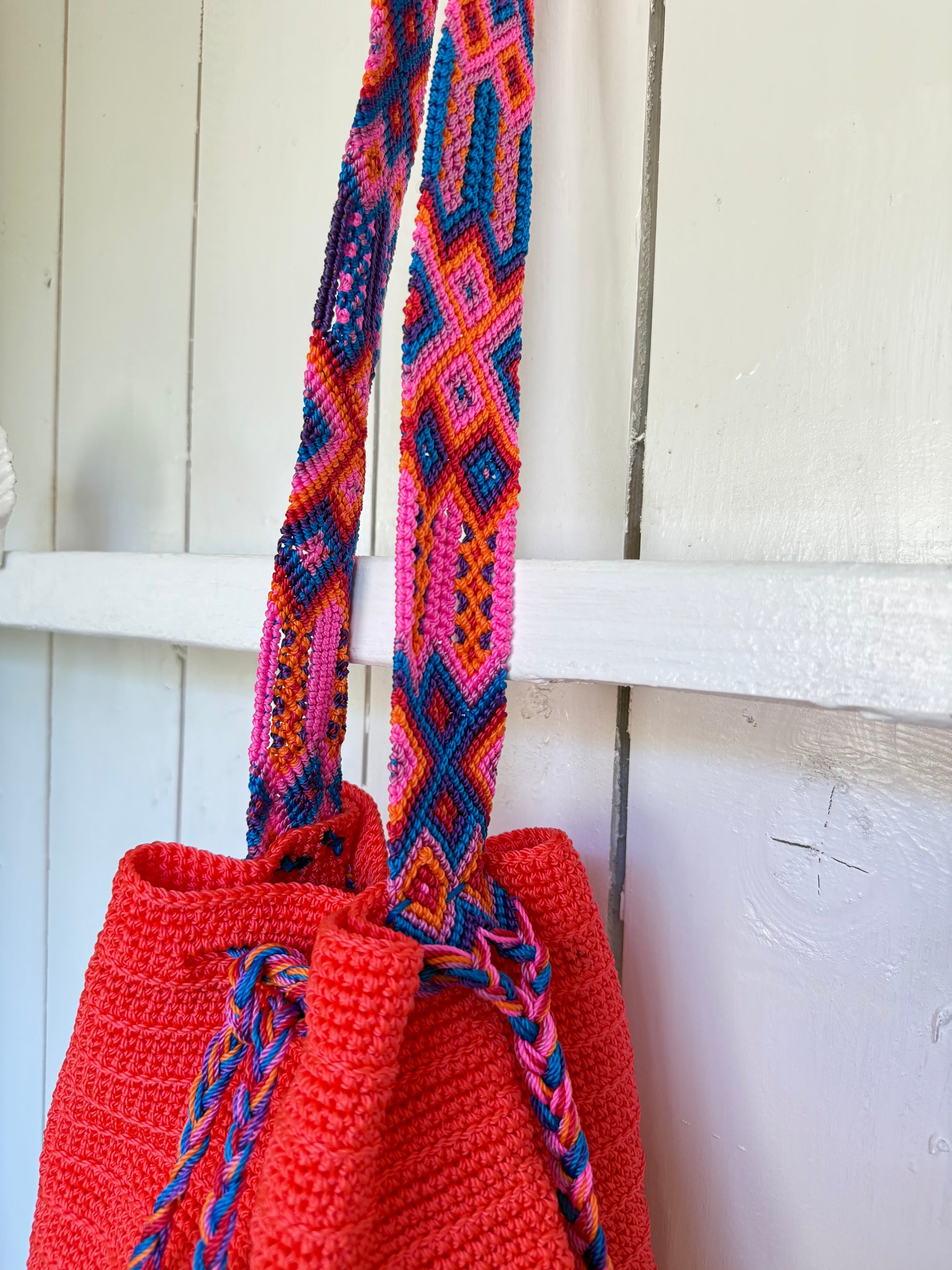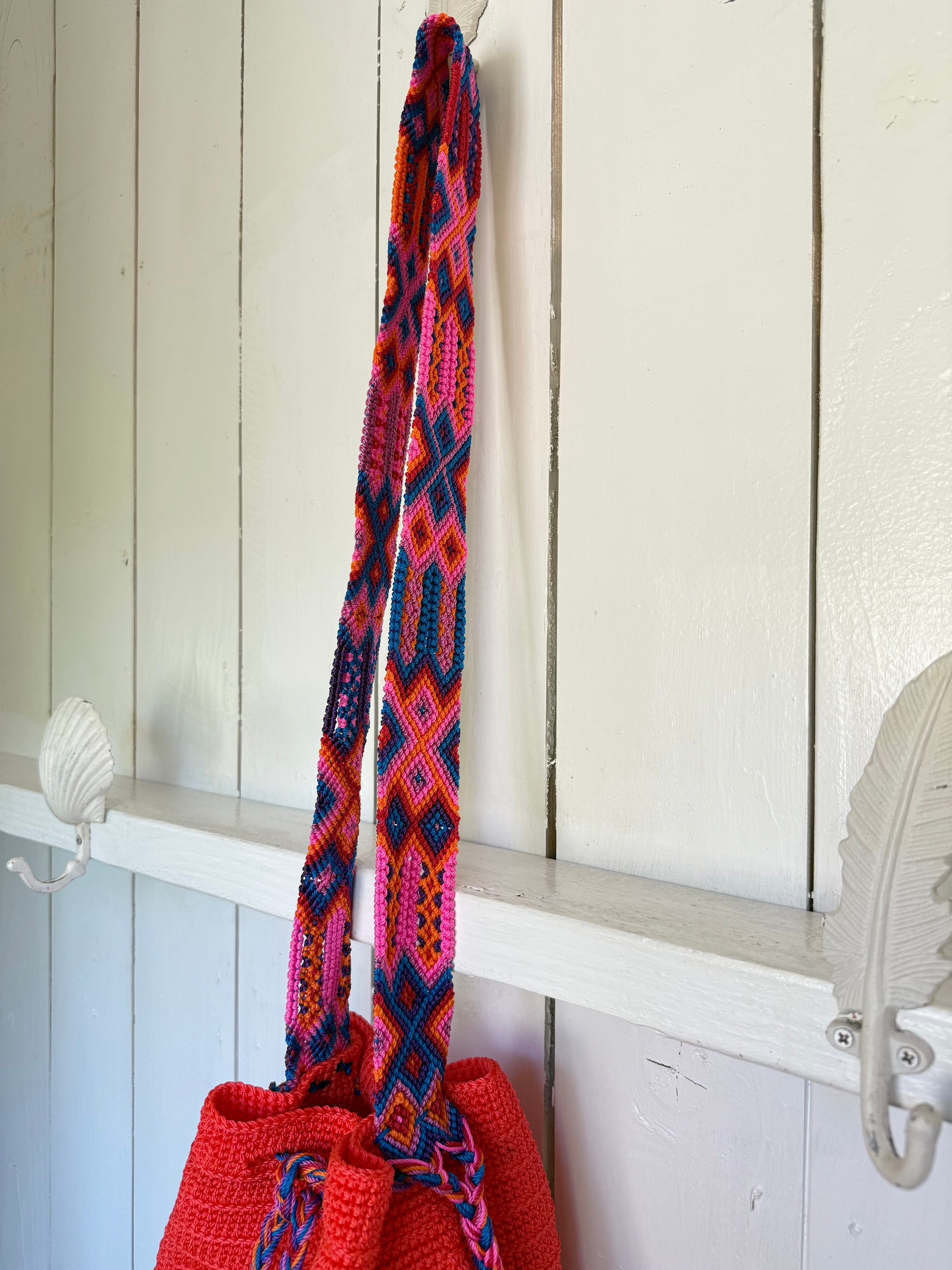 Mexican Handwoven Bucket Bag | Multi color Strap Medium Neon Orange