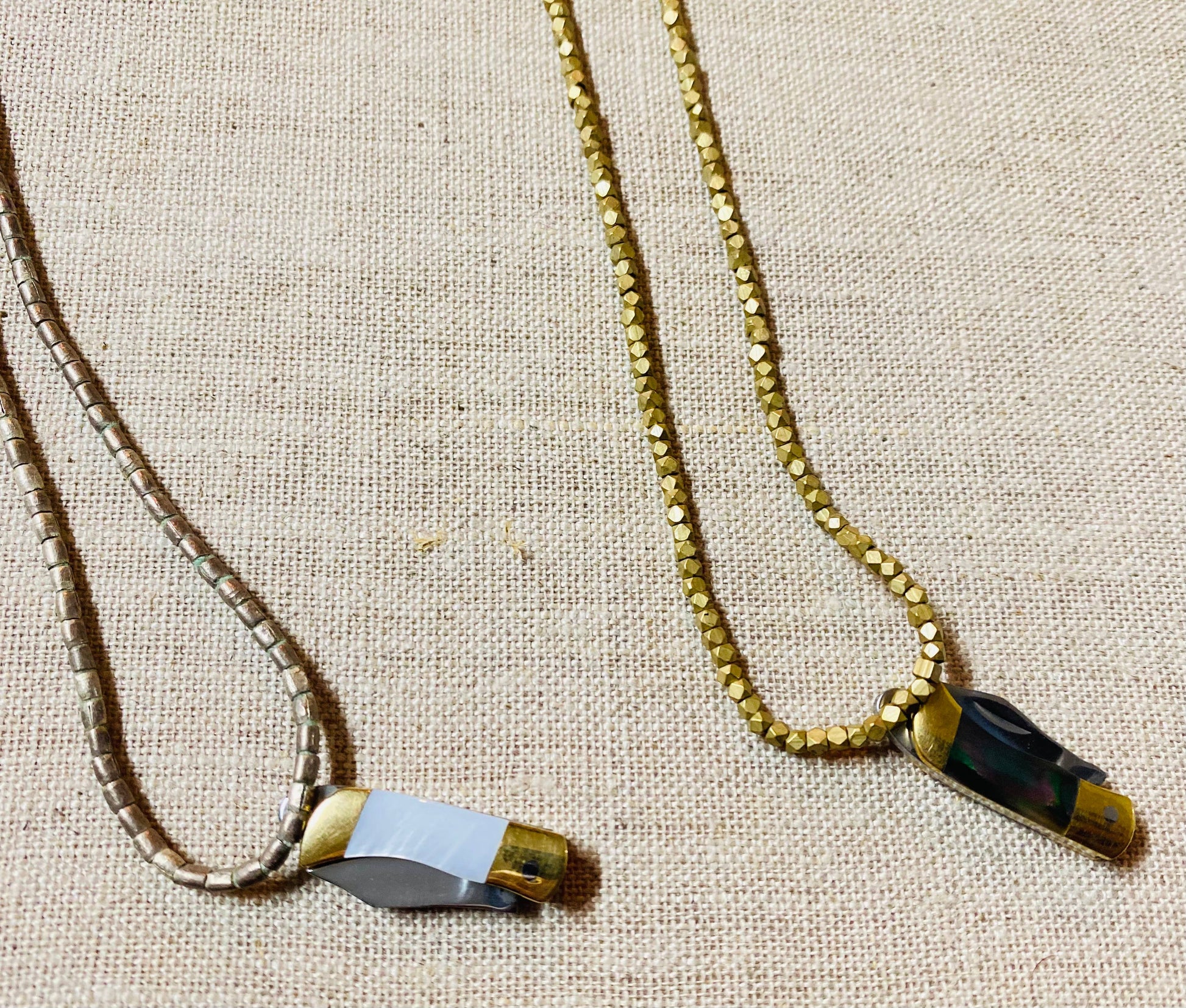 Mini brass shell knife can be added to a key chain, a necklace, or your bag. Great for opening letters, safety, or decor.