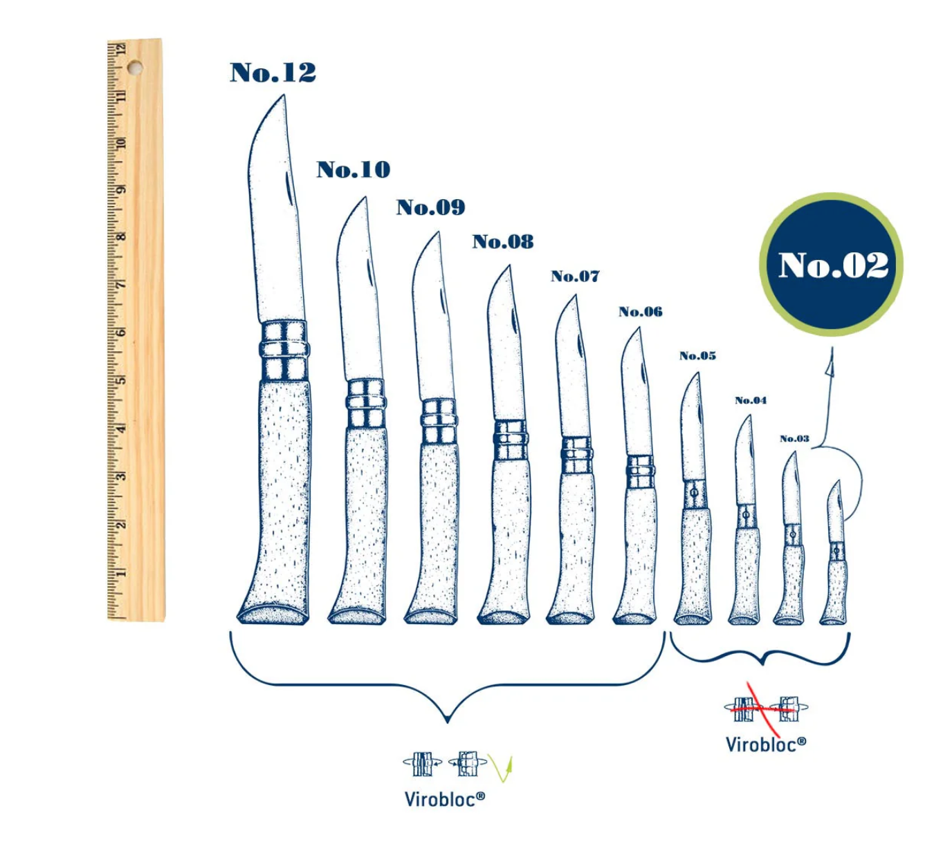 The No.02 is one of our smallest folding knives and does not feature the Virobloc safety ring. The No.02 is used as an every day carry for many people. It comes in a variety of colors and is available with, or without a keychain which makes the knife very convenient!