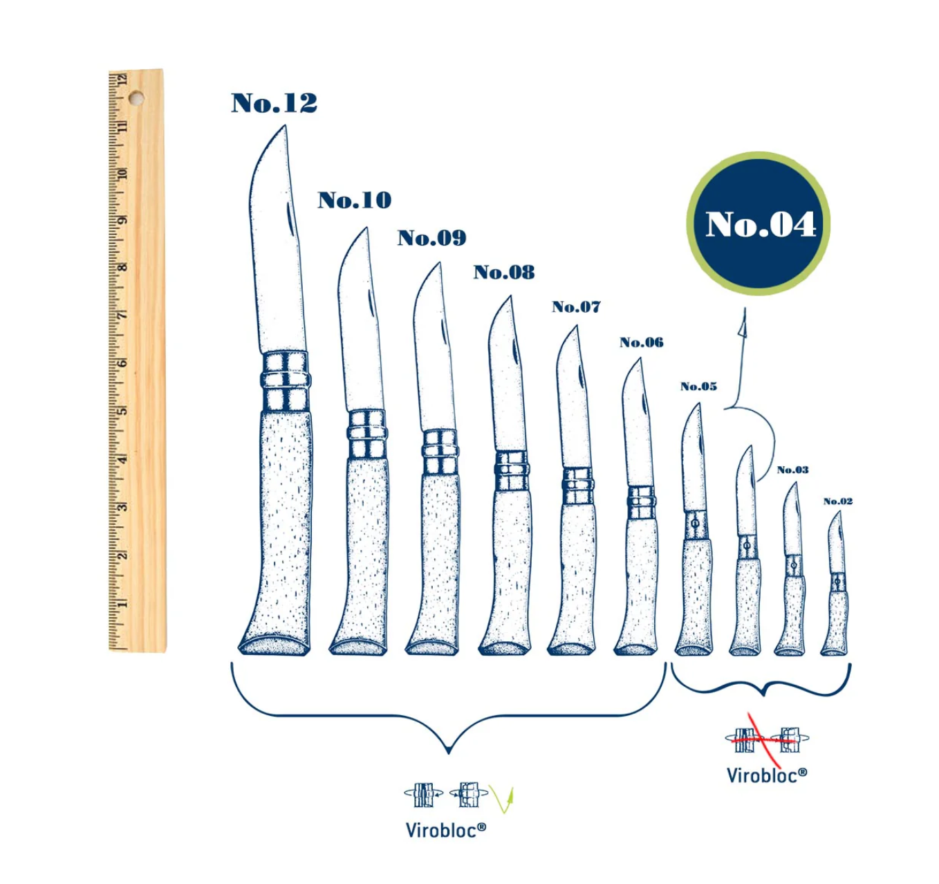 The No.04 is one of our smallest folding knives and does not feature the Virobloc safety ring. The No.04 is used as an every day carry for many people. It comes in a variety of colors and is available with, or without a keychain which makes the knife very convenient!