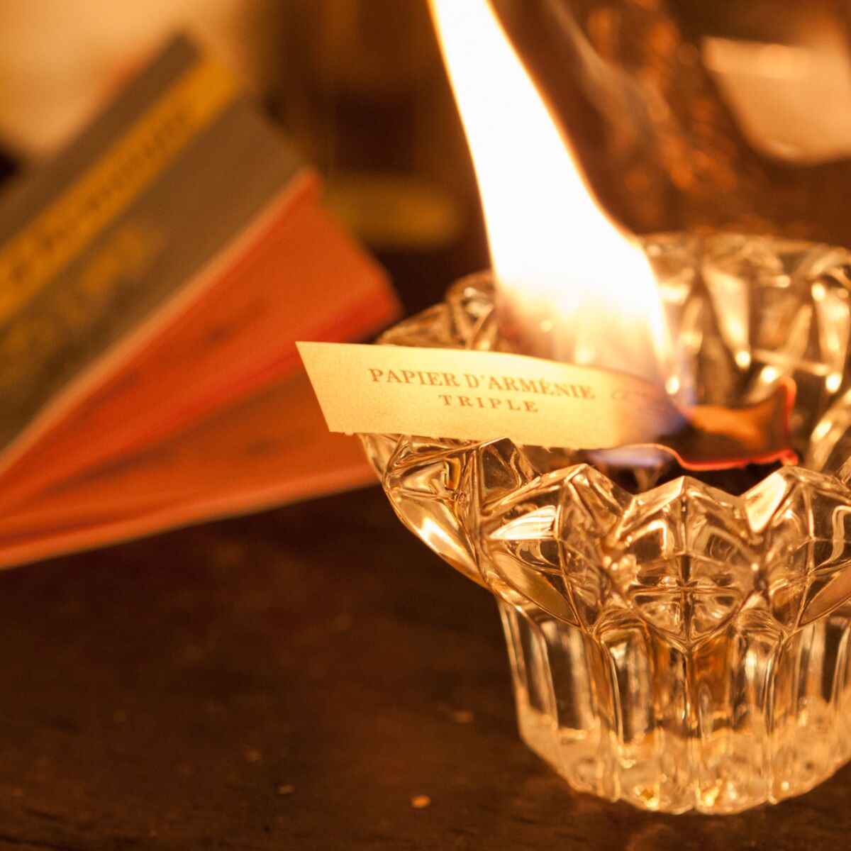 Tear off one strip, fold it like an accordion and place it on its longest thinnest side on a heat-resistant surface. Light it, blow gently so that the paper does not burn up (Papier d’Arménie® should burn slowly).