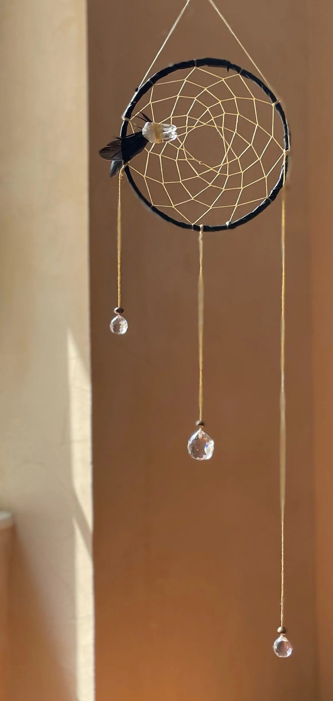 Various Crystals ( amethyst, quartz, danburite)is wrapped into the web with small feather detail